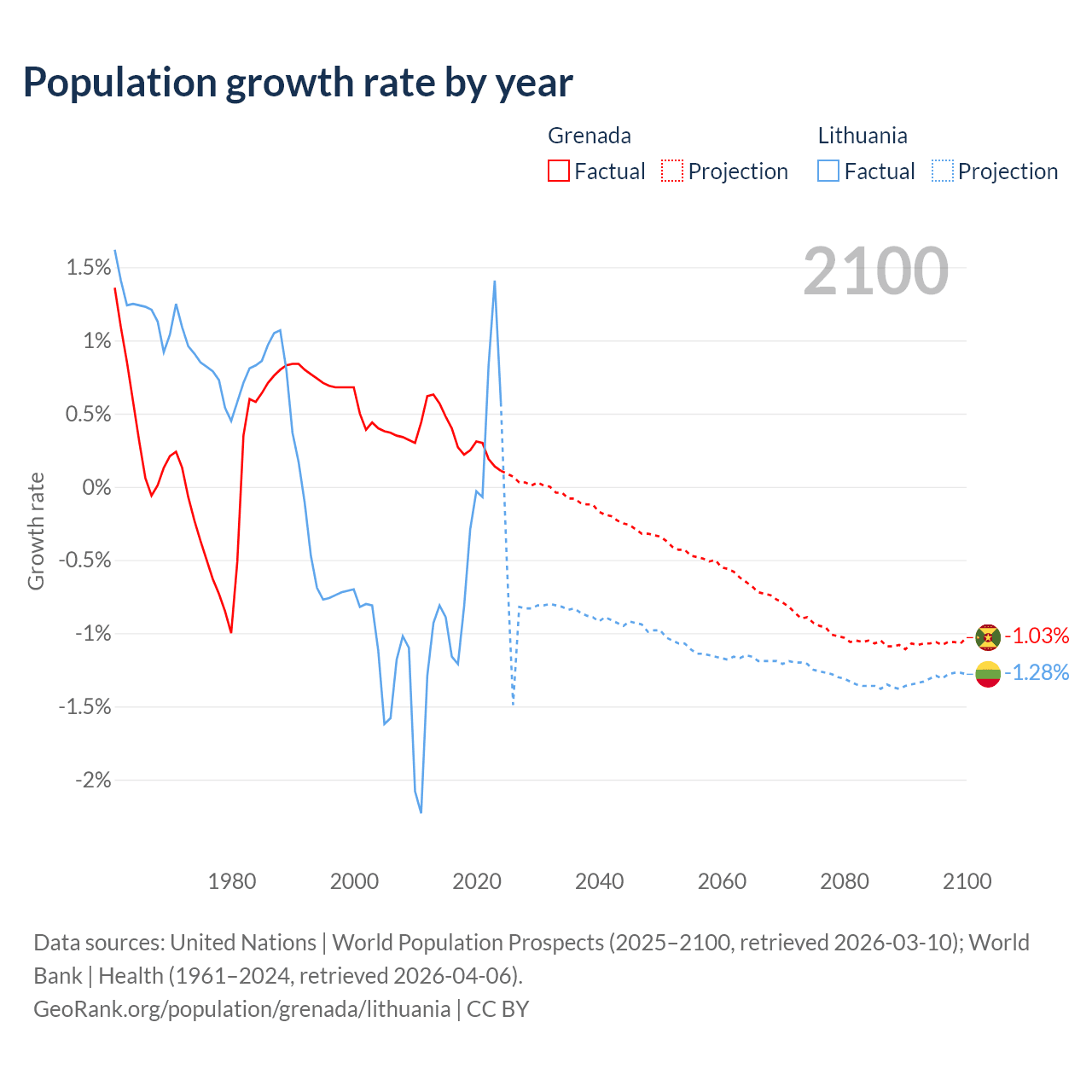 - For the last 10 years, Grenada has had an average growth rate of +0.29% per year vs -0.22% in Lithuania.