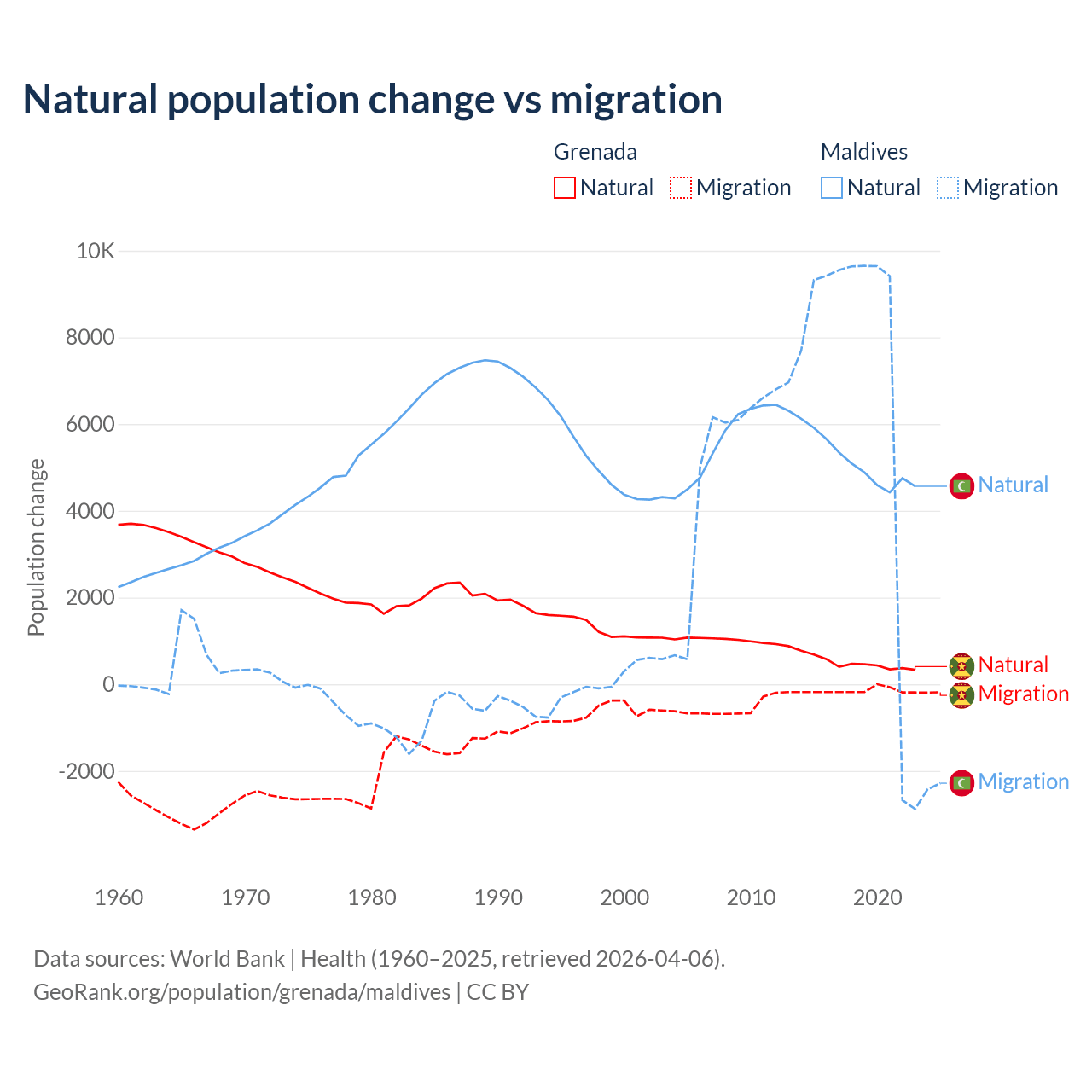 Over the last 10 years, 76% of the population change in Grenada is from natural causes (a gain of 4,850 people) and 24% is from migration (a loss of 1,535 people). In Maldives 42.7% is from natural causes (a gain of 51,342 people) and 57.3% is from migration (a gain of 68,788 people).