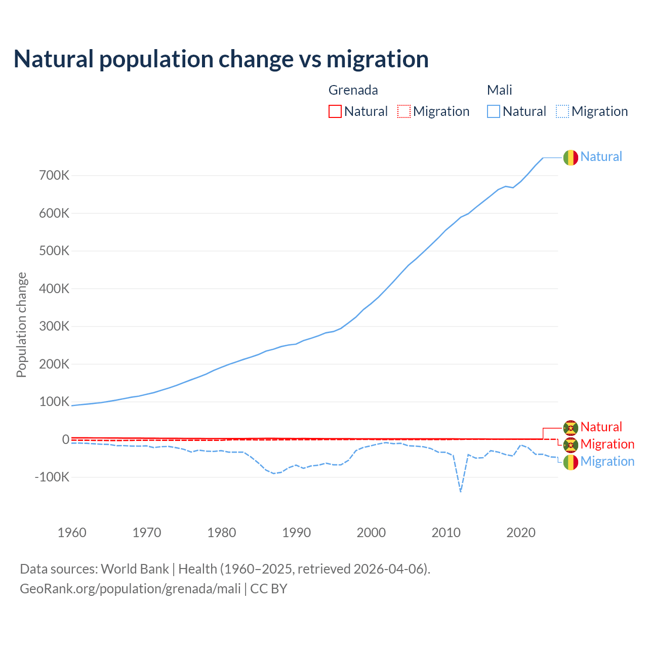 Over the last 10 years, 76% of the population change in Grenada is from natural causes (a gain of 4,850 people) and 24% is from migration (a loss of 1,535 people). In Mali 94.9% is from natural causes (a gain of 6,749,473 people) and 5.13% is from migration (a loss of 365,292 people).