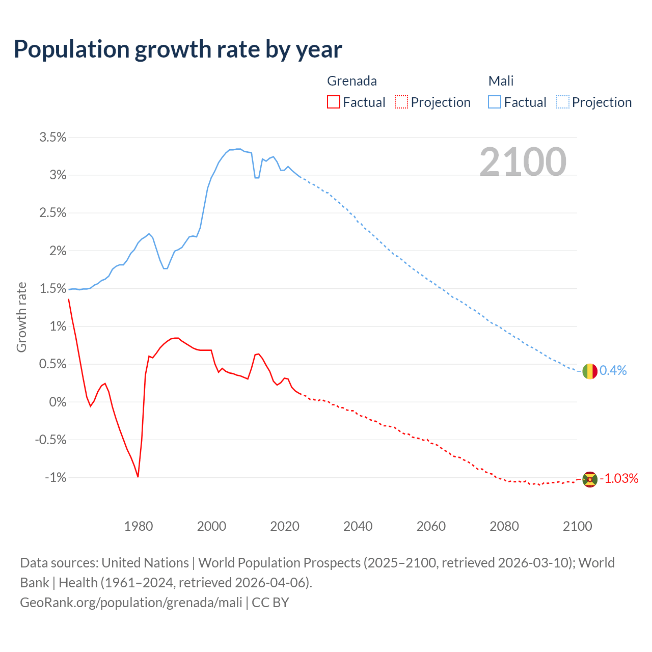 - For the last 10 years, Grenada has had an average growth rate of +0.29% per year vs +3.12% in Mali.