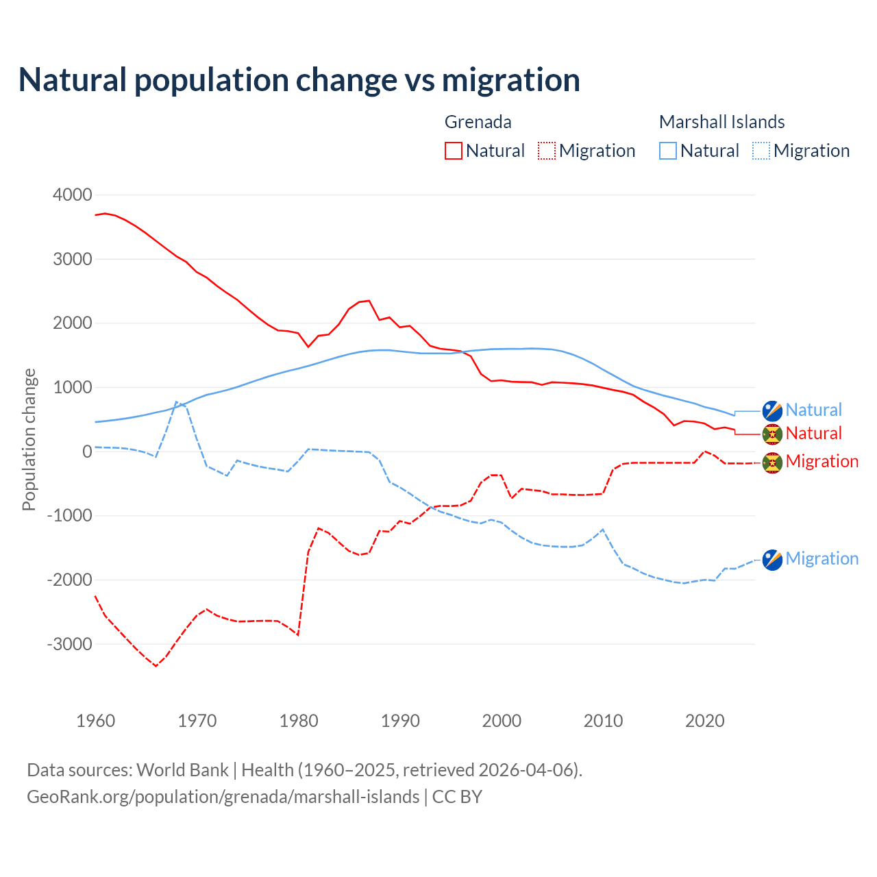 Over the last 10 years, 76% of the population change in Grenada is from natural causes (a gain of 4,850 people) and 24% is from migration (a loss of 1,535 people). In the Marshall Islands 27.8% is from natural causes (a gain of 7,592 people) and 72.2% is from migration (a loss of 19,682 people).