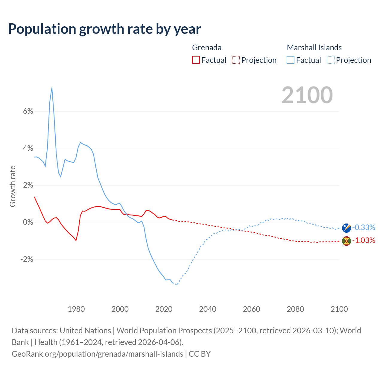 - Since 2006, the population of Grenada has increased from 110K people to 117K (6.6% growth), while the Marshall Islands has declined from 52K to 35.1K (32.6% decline).