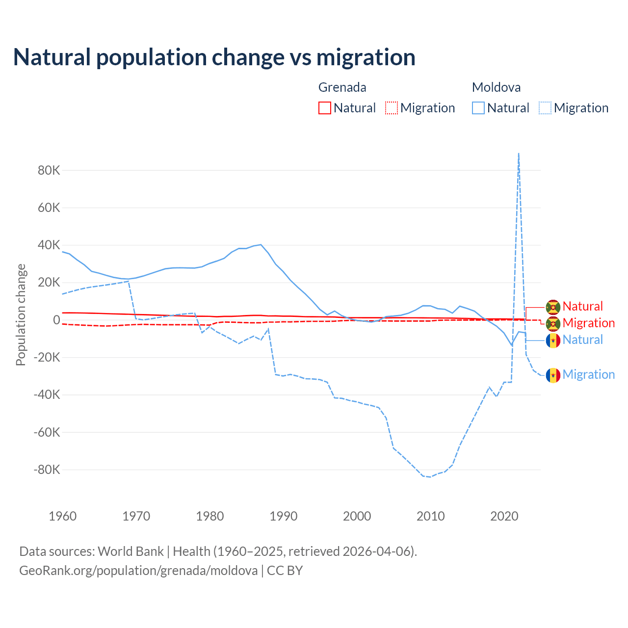 Over the last 10 years, 76% of the population change in Grenada is from natural causes (a gain of 4,850 people) and 24% is from migration (a loss of 1,535 people). In Moldova 6.04% is from natural causes (a loss of 19,001 people) and 94% is from migration (a loss of 295,631 people).