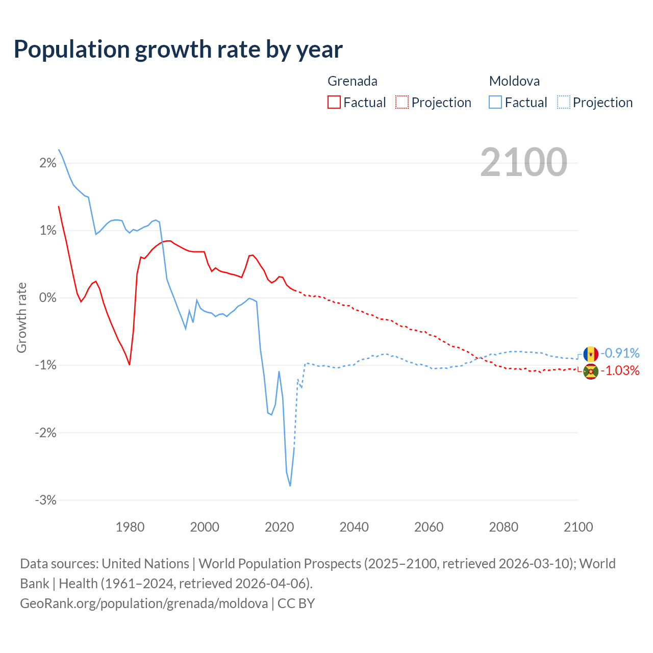 - For the last 10 years, Grenada has had an average growth rate of +0.29% per year vs -1.57% in Moldova.