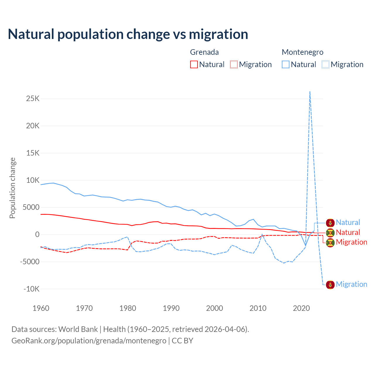 Over the last 10 years, 76% of the population change in Grenada is from natural causes (a gain of 4,850 people) and 24% is from migration (a loss of 1,535 people). In Montenegro 52.4% is from natural causes (a gain of 4,501 people) and 47.6% is from migration (a gain of 4,095 people).