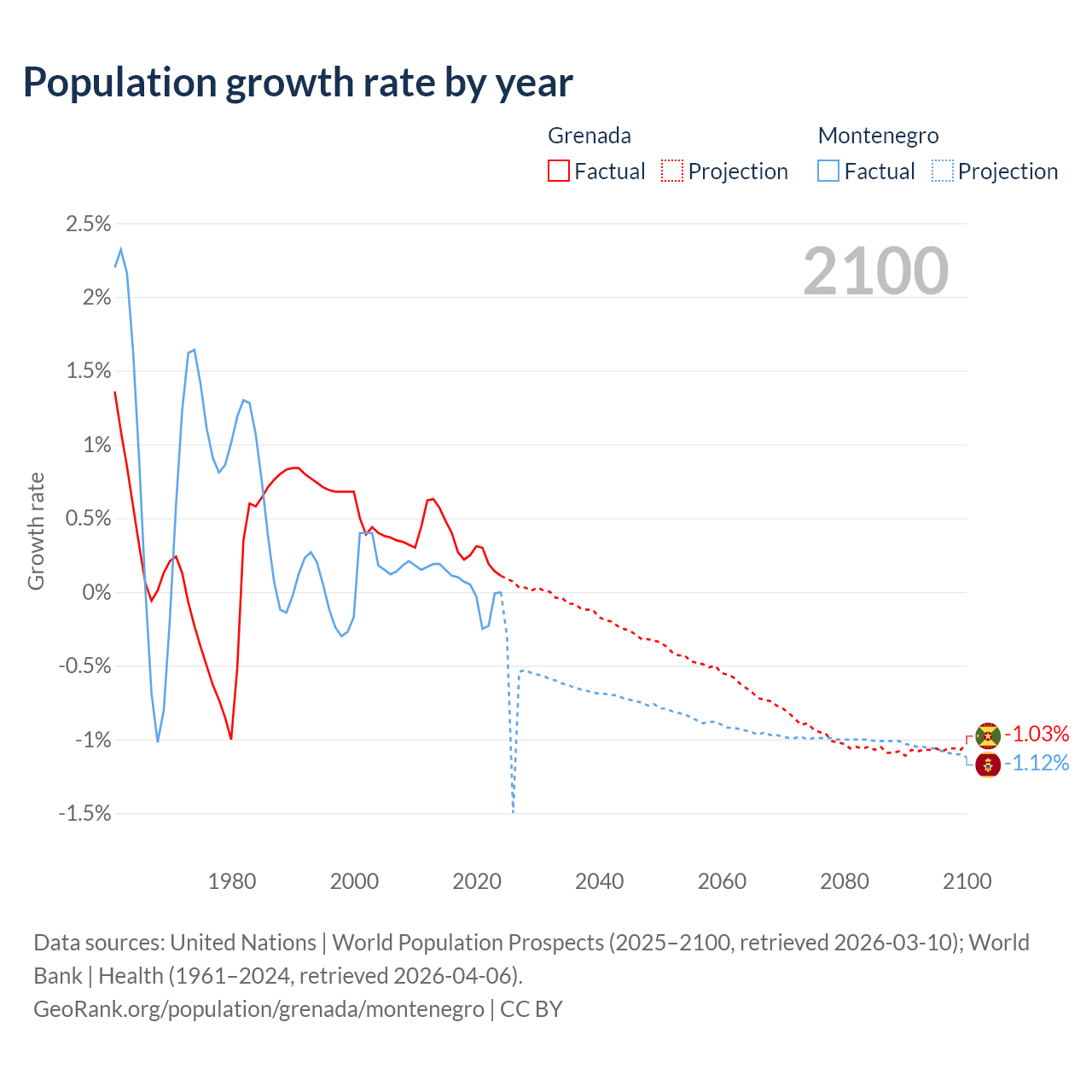 - For the last 10 years, Grenada has had an average growth rate of +0.29% per year vs +0.01% in Montenegro.