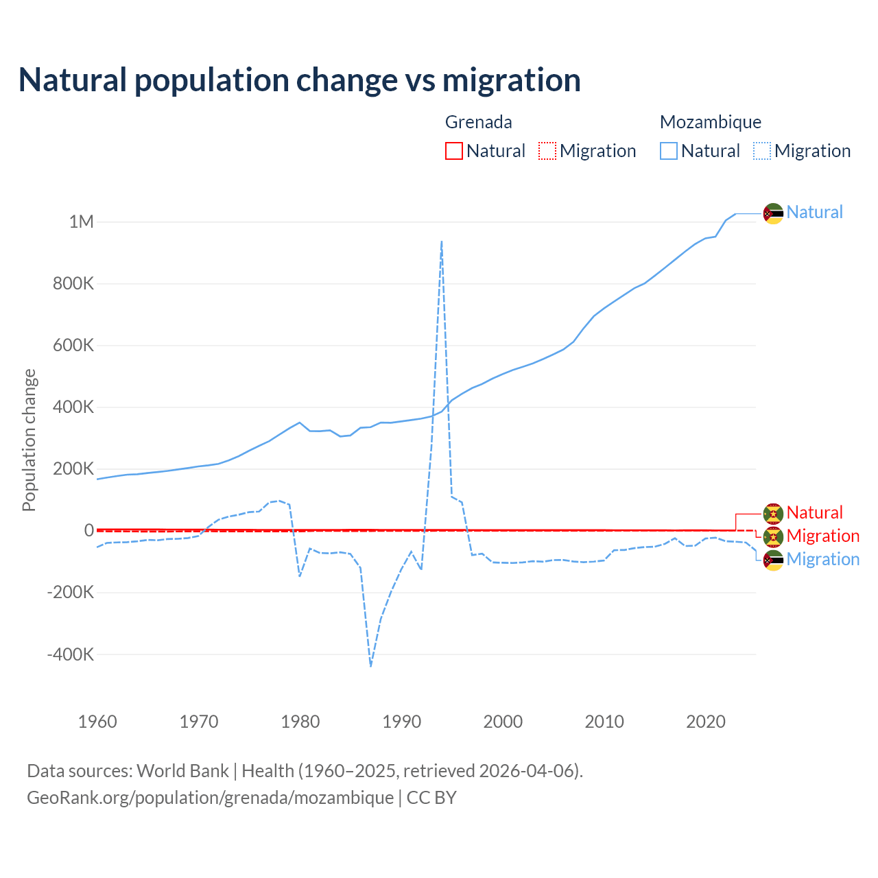 Over the last 10 years, 76% of the population change in Grenada is from natural causes (a gain of 4,850 people) and 24% is from migration (a loss of 1,535 people). In Mozambique 95.9% is from natural causes (a gain of 9,108,203 people) and 4.15% is from migration (a loss of 393,923 people).