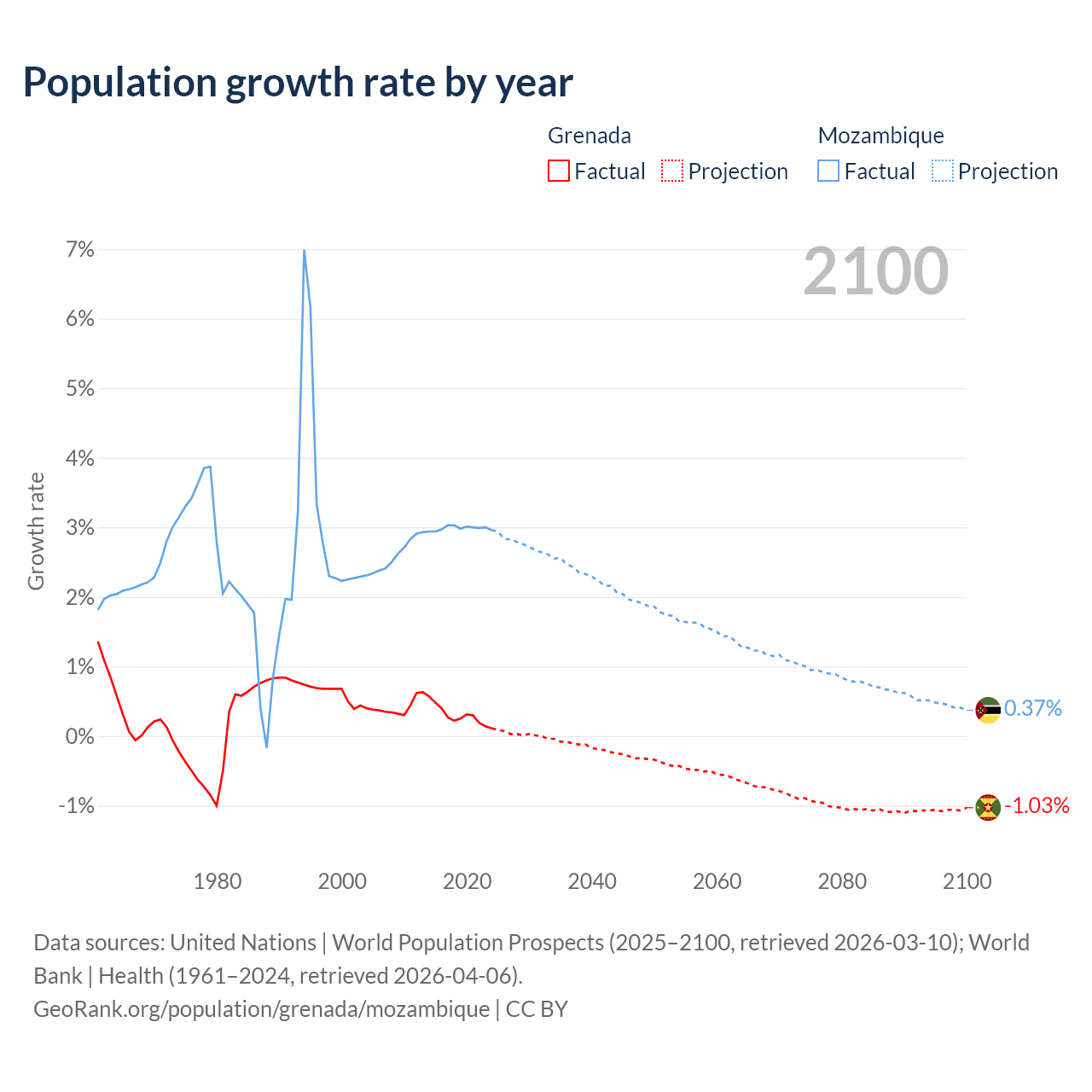 - For the last 10 years, Grenada has had an average growth rate of +0.29% per year vs +2.99% in Mozambique.