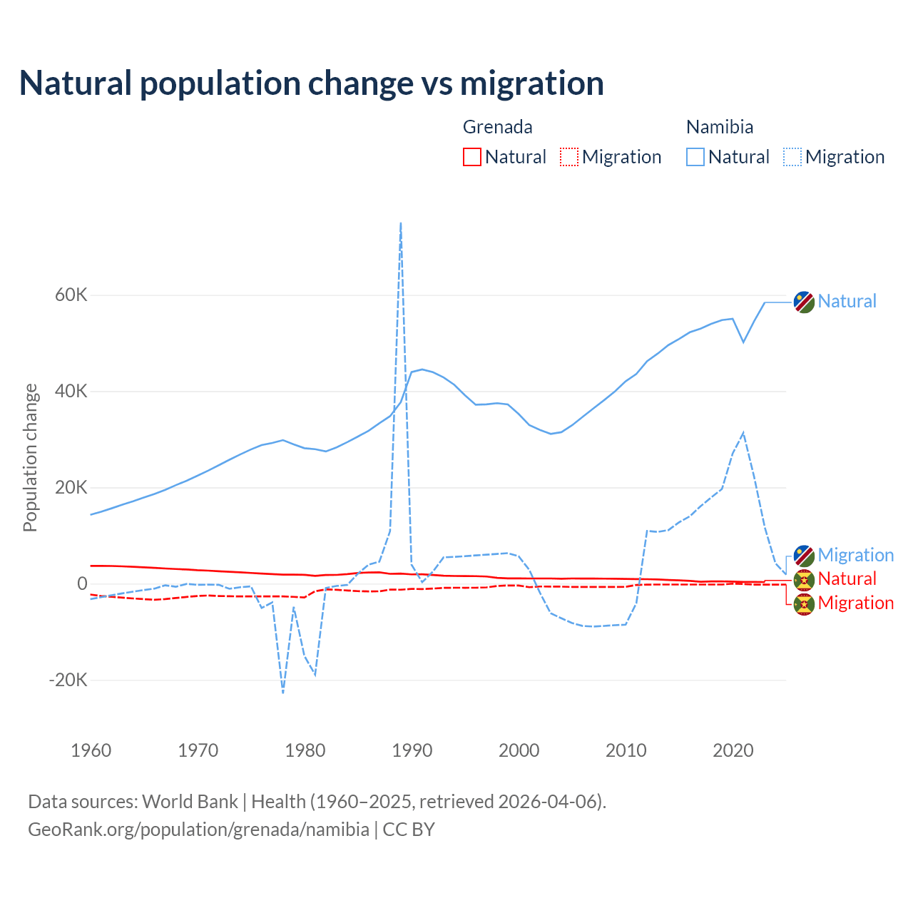 Over the last 10 years, 76% of the population change in Grenada is from natural causes (a gain of 4,850 people) and 24% is from migration (a loss of 1,535 people). In Namibia 74.3% is from natural causes (a gain of 532,532 people) and 25.7% is from migration (a gain of 183,837 people).