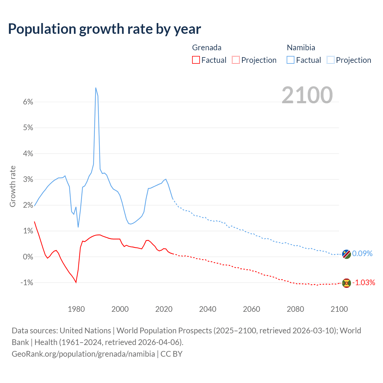 - For the last 10 years, Grenada has had an average growth rate of +0.29% per year vs +2.73% in Namibia.
