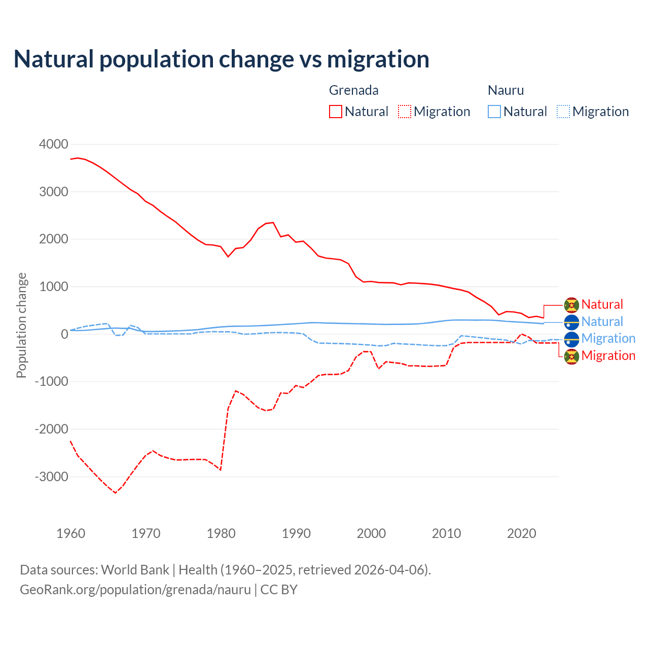 Over the last 10 years, 76% of the population change in Grenada is from natural causes (a gain of 4,850 people) and 24% is from migration (a loss of 1,535 people). In Nauru 66.2% is from natural causes (a gain of 2,590 people) and 33.8% is from migration (a loss of 1,320 people).