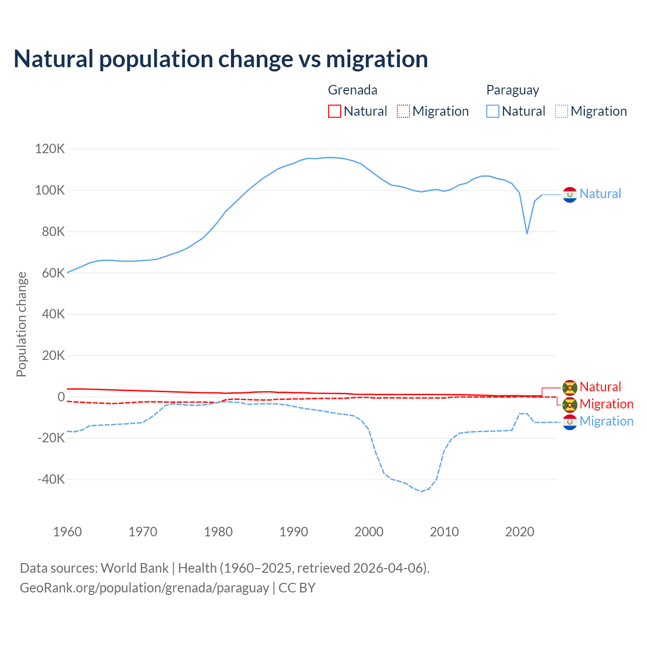 Over the last 10 years, 76% of the population change in Grenada is from natural causes (a gain of 4,850 people) and 24% is from migration (a loss of 1,535 people). In Paraguay 87.6% is from natural causes (a gain of 1,002,636 people) and 12.4% is from migration (a loss of 141,377 people).