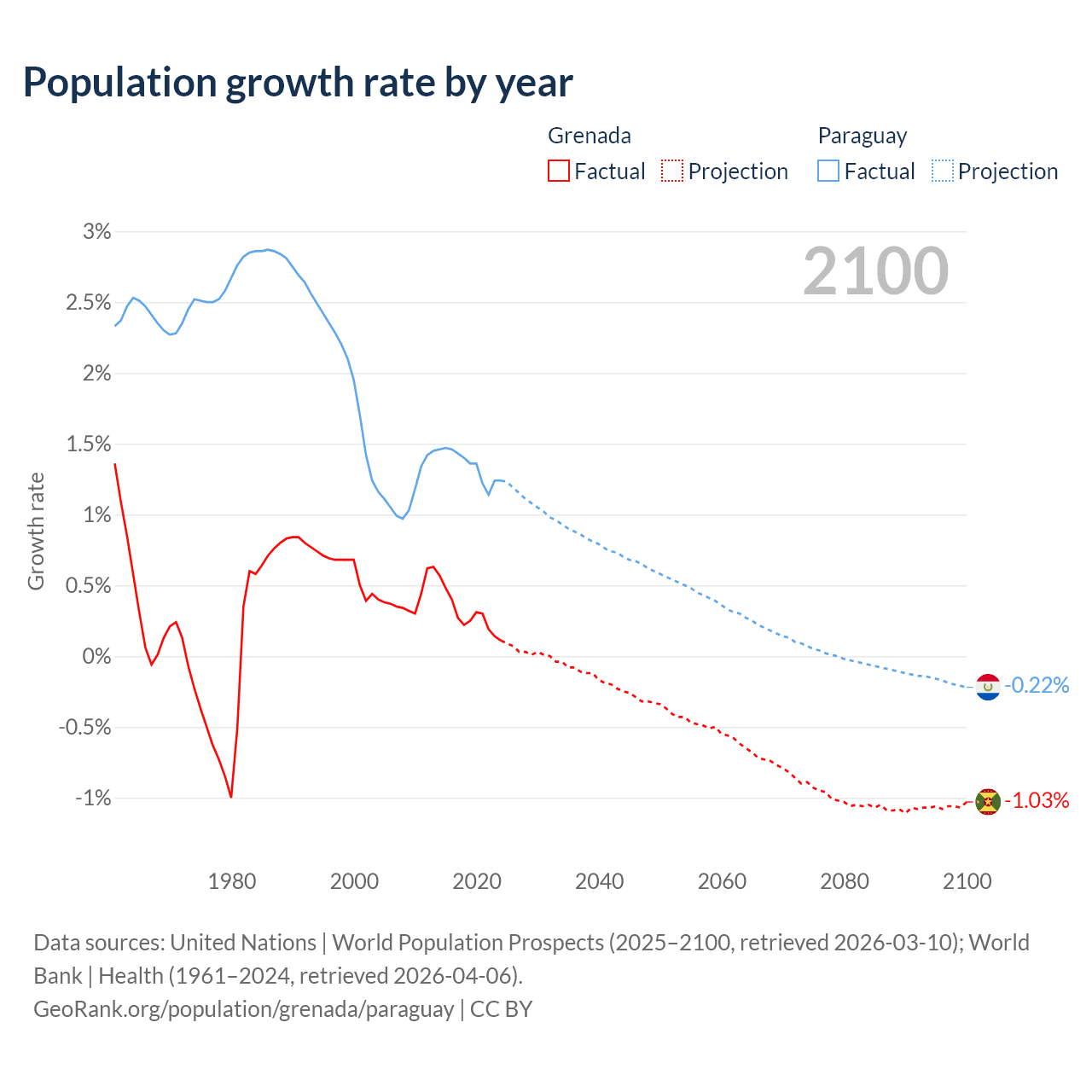 - For the last 10 years, Grenada has had an average growth rate of +0.29% per year vs +1.34% in Paraguay.