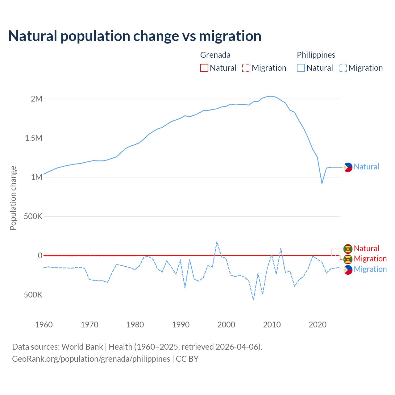 Over the last 10 years, 76% of the population change in Grenada is from natural causes (a gain of 4,850 people) and 24% is from migration (a loss of 1,535 people). In the Philippines 88.5% is from natural causes (a gain of 14,279,705 people) and 11.5% is from migration (a loss of 1,848,117 people).