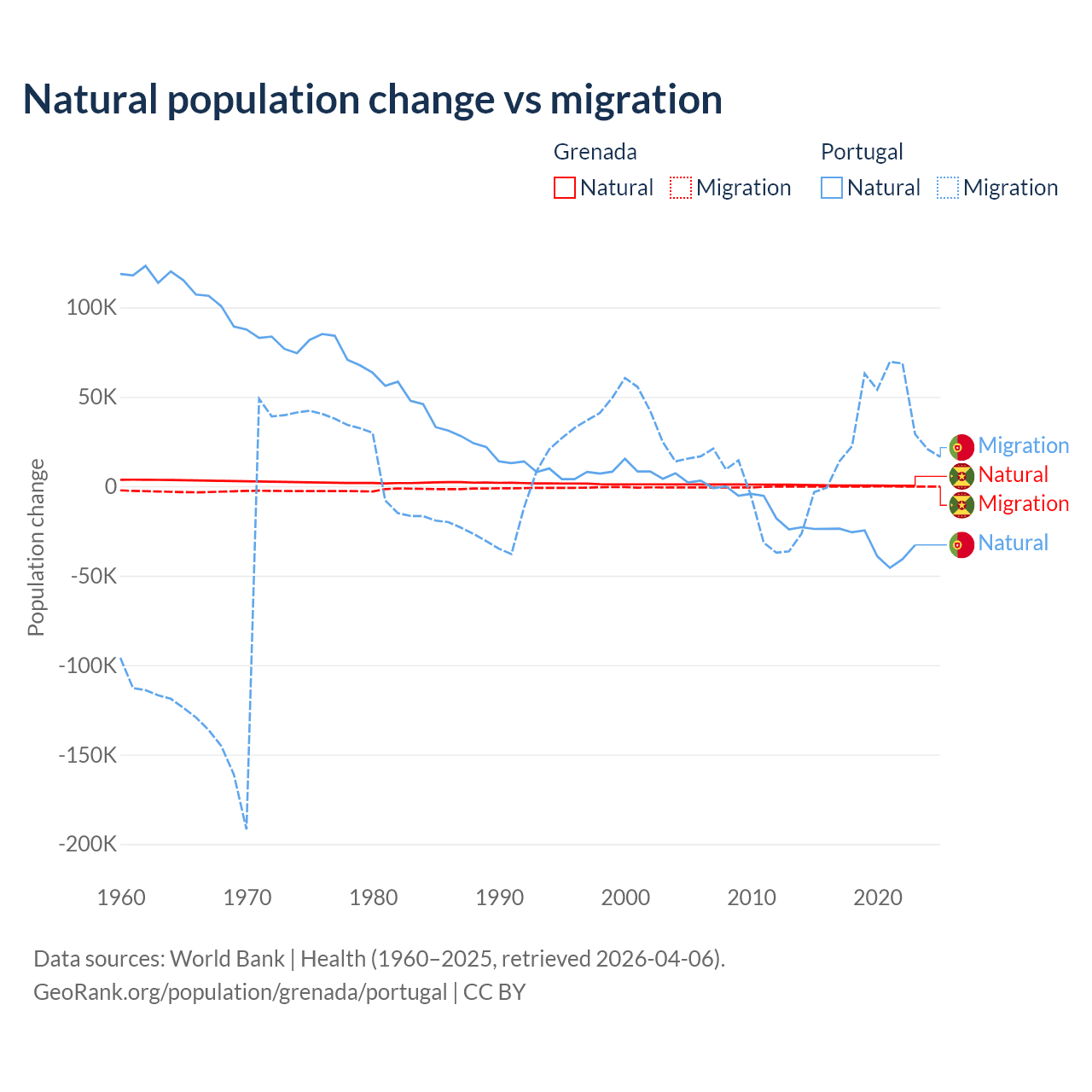 Over the last 10 years, 76% of the population change in Grenada is from natural causes (a gain of 4,850 people) and 24% is from migration (a loss of 1,535 people). In Portugal 51% is from natural causes (a loss of 302,748 people) and 49% is from migration (a gain of 290,554 people).