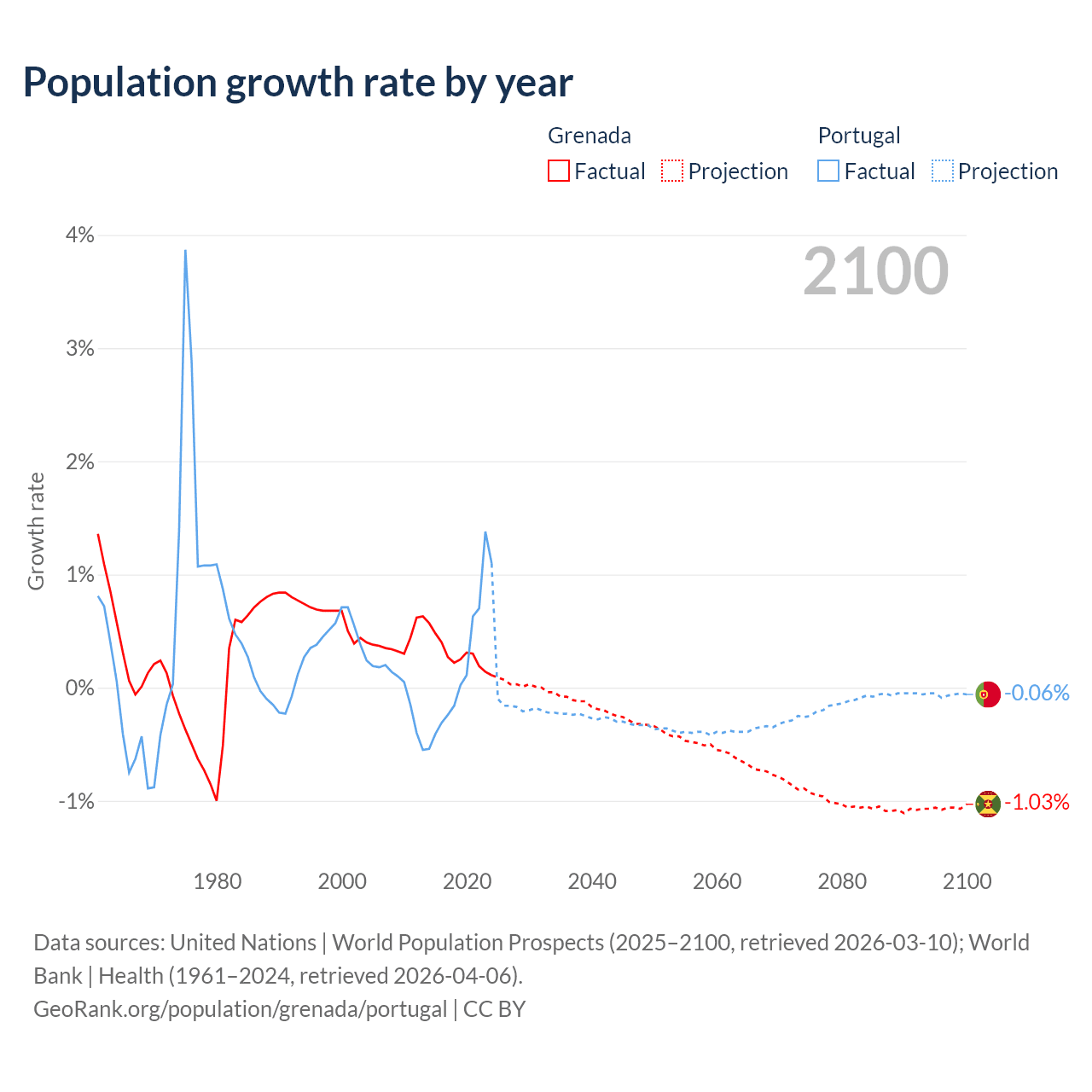 - For the last 10 years, Grenada has had an average growth rate of +0.29% per year vs +0.21% in Portugal.