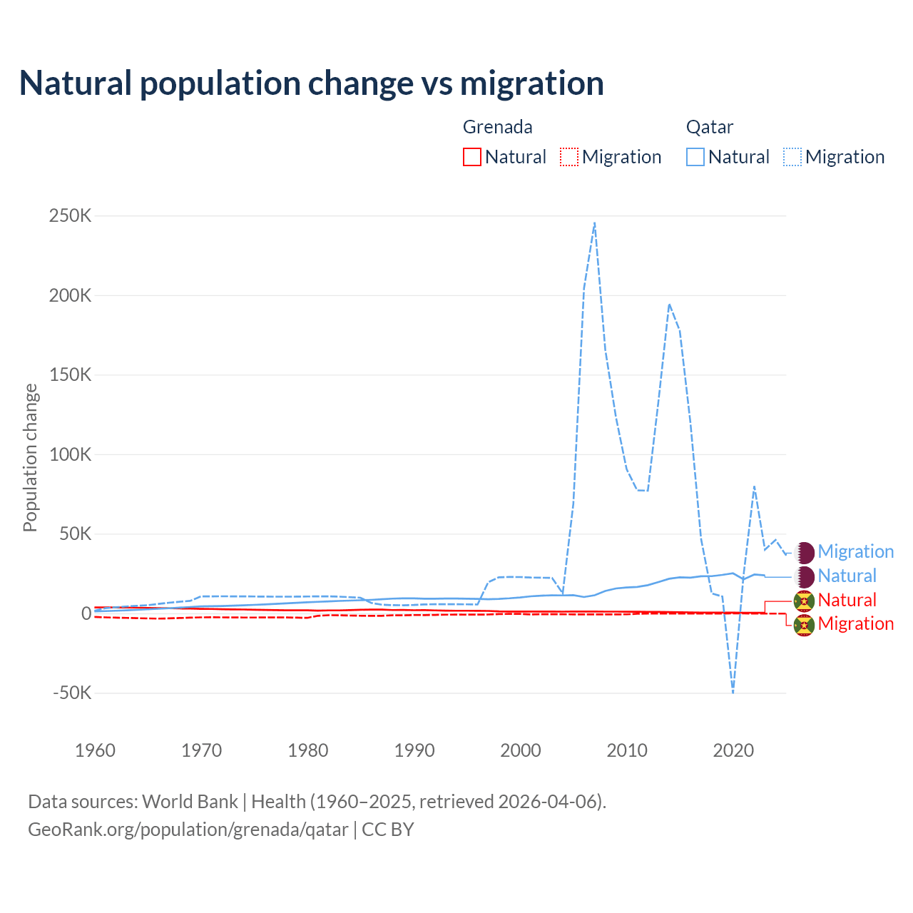 Over the last 10 years, 76% of the population change in Grenada is from natural causes (a gain of 4,850 people) and 24% is from migration (a loss of 1,535 people). In Qatar 26.1% is from natural causes (a gain of 232,009 people) and 73.9% is from migration (a gain of 655,712 people).