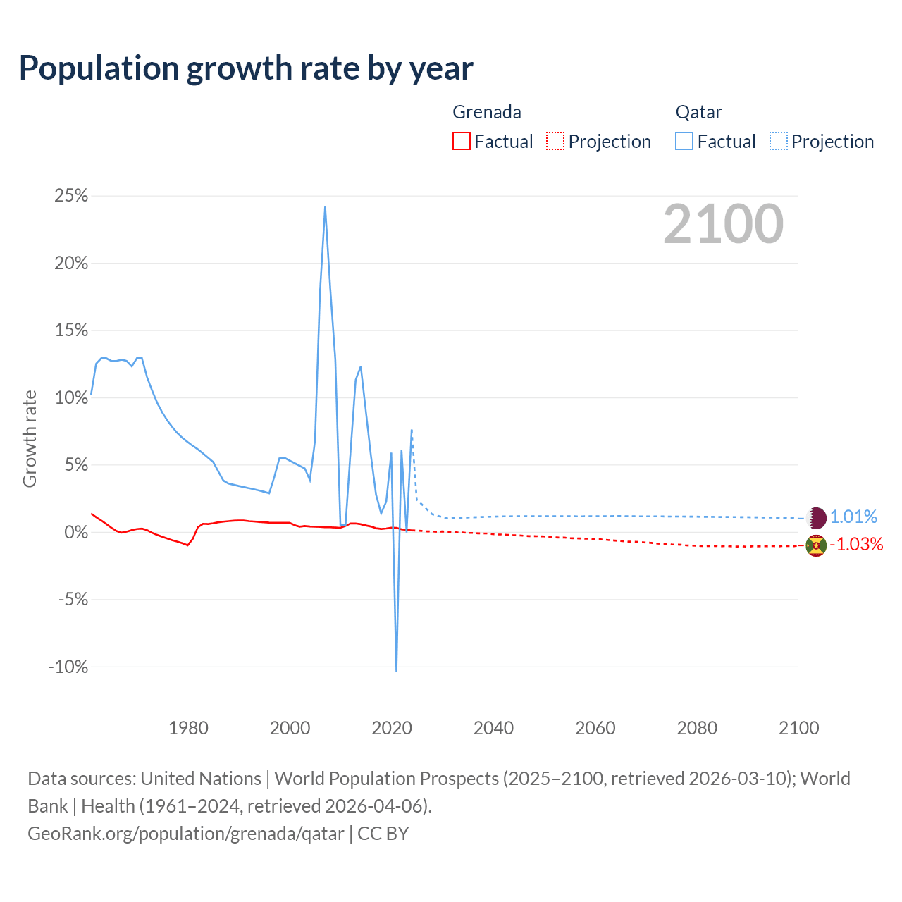 - For the last 10 years, Grenada has had an average growth rate of +0.29% per year vs +3.86% in Qatar.