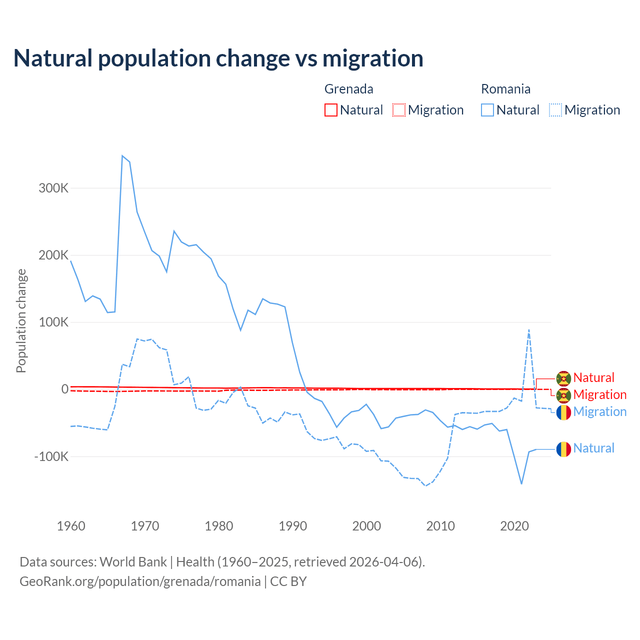 Over the last 10 years, 76% of the population change in Grenada is from natural causes (a gain of 4,850 people) and 24% is from migration (a loss of 1,535 people). In Romania 82% is from natural causes (a loss of 766,295 people) and 18% is from migration (a loss of 167,917 people).