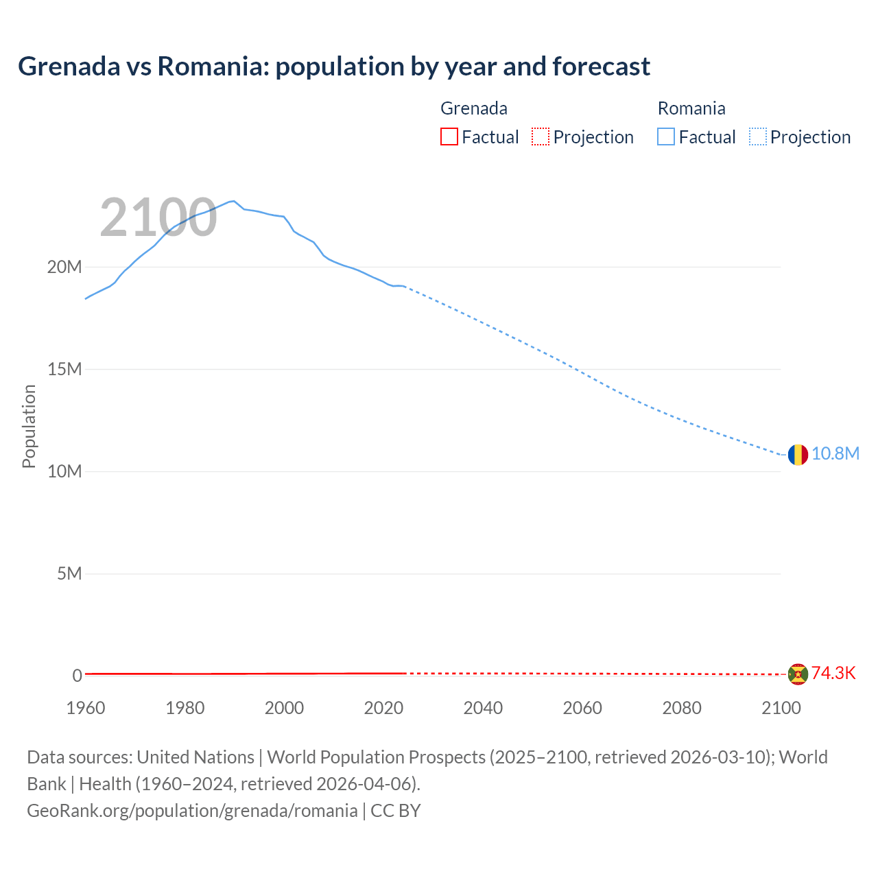 Grenada vs Romania: population by year and forecast