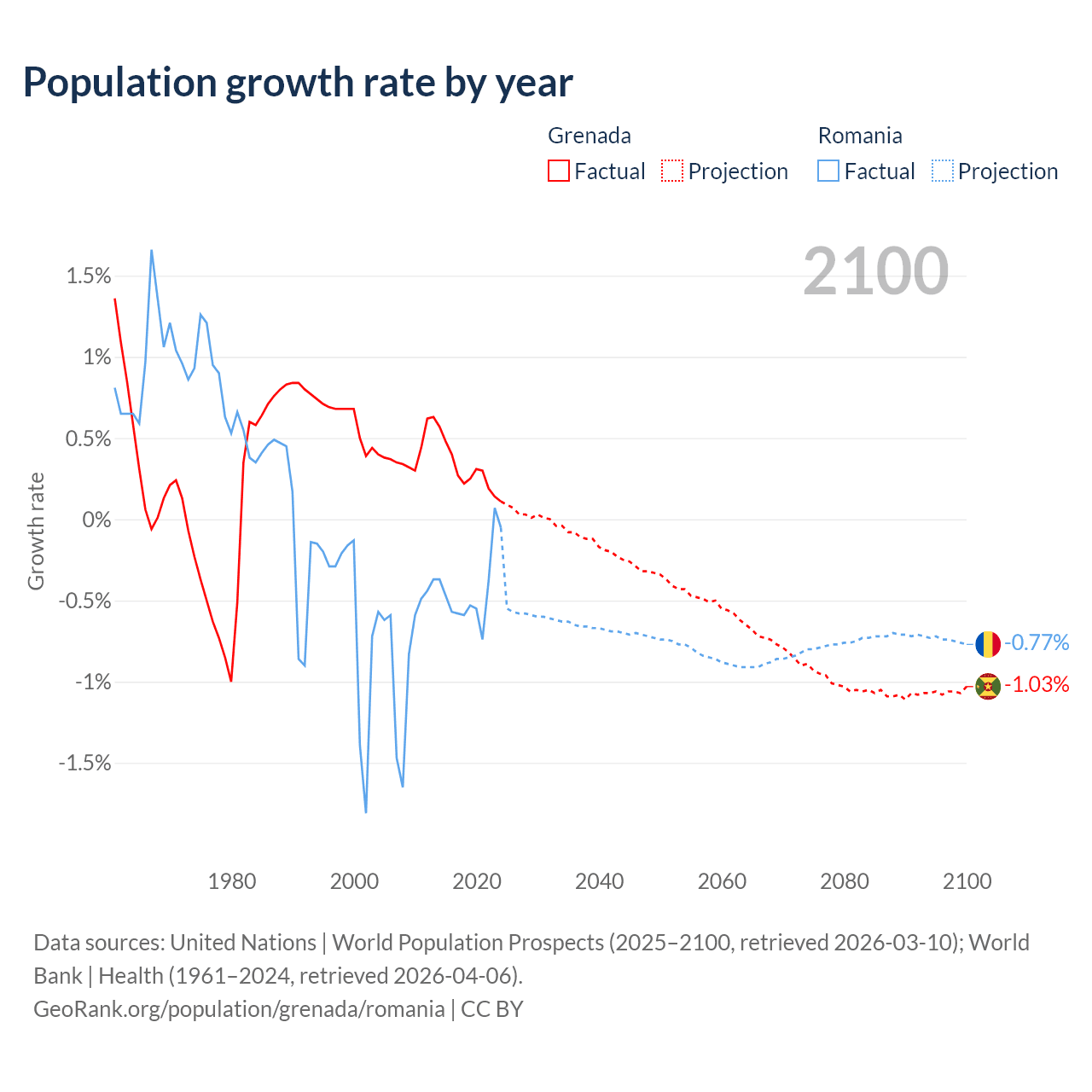 - For the last 10 years, Grenada has had an average growth rate of +0.29% per year vs -0.43% in Romania.