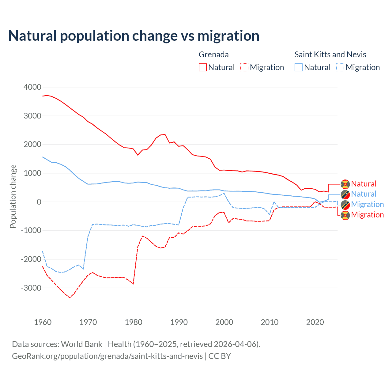 Over the last 10 years, 76% of the population change in Grenada is from natural causes (a gain of 4,850 people) and 24% is from migration (a loss of 1,535 people). In Saint Kitts and Nevis 44.9% is from natural causes (a gain of 1,225 people) and 55.1% is from migration (a loss of 1,506 people).