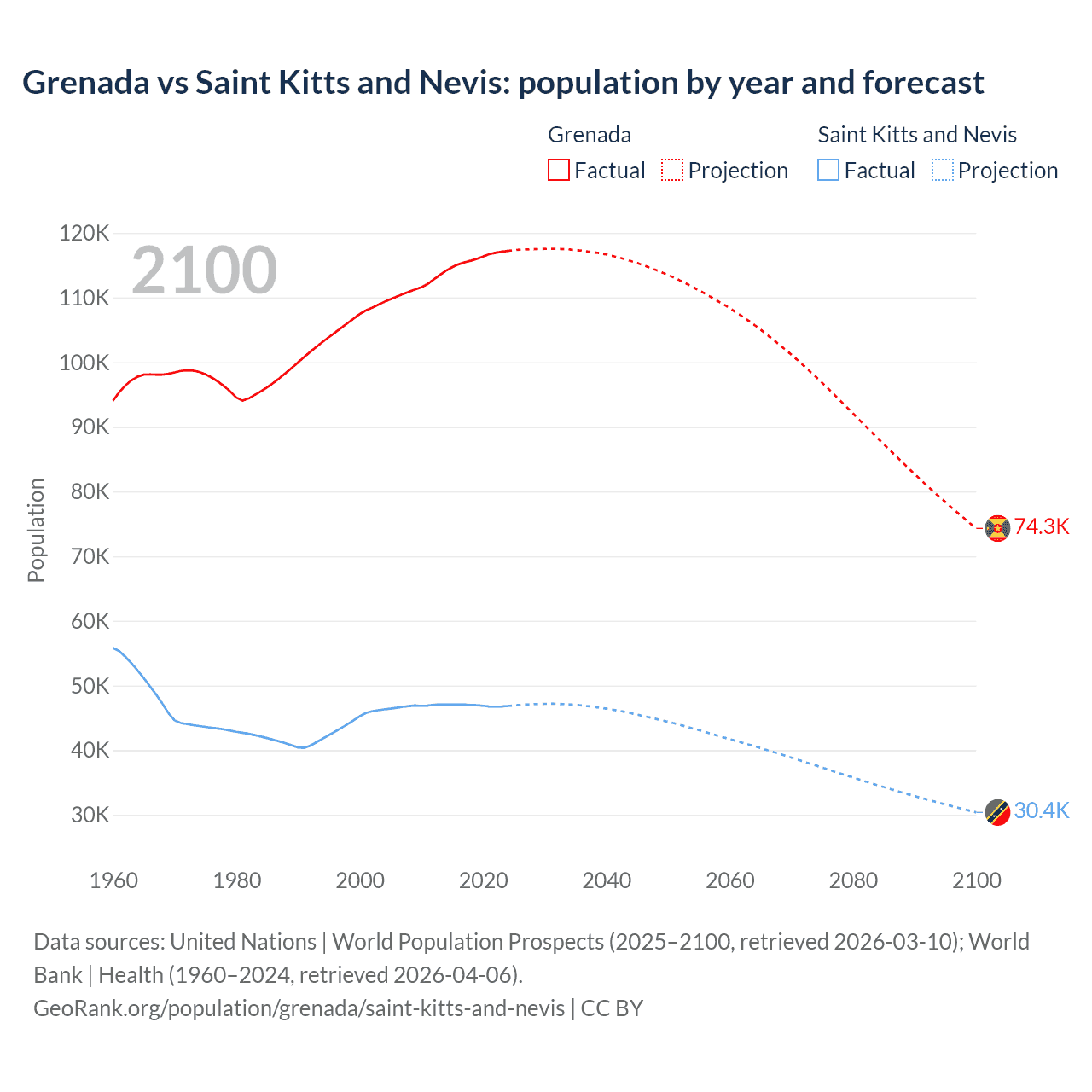 Grenada vs Saint Kitts and Nevis: population by year and forecast
