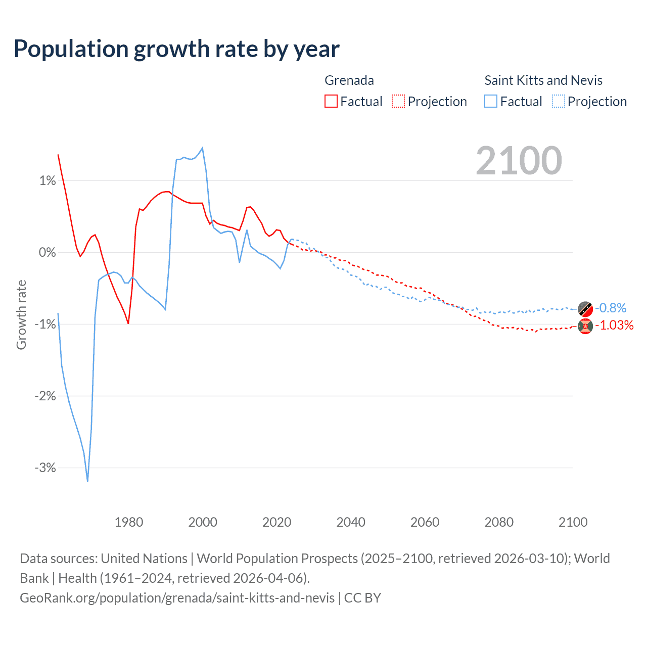 - For the last 10 years, Grenada has had an average growth rate of +0.29% per year vs -0.04% in Saint Kitts and Nevis.