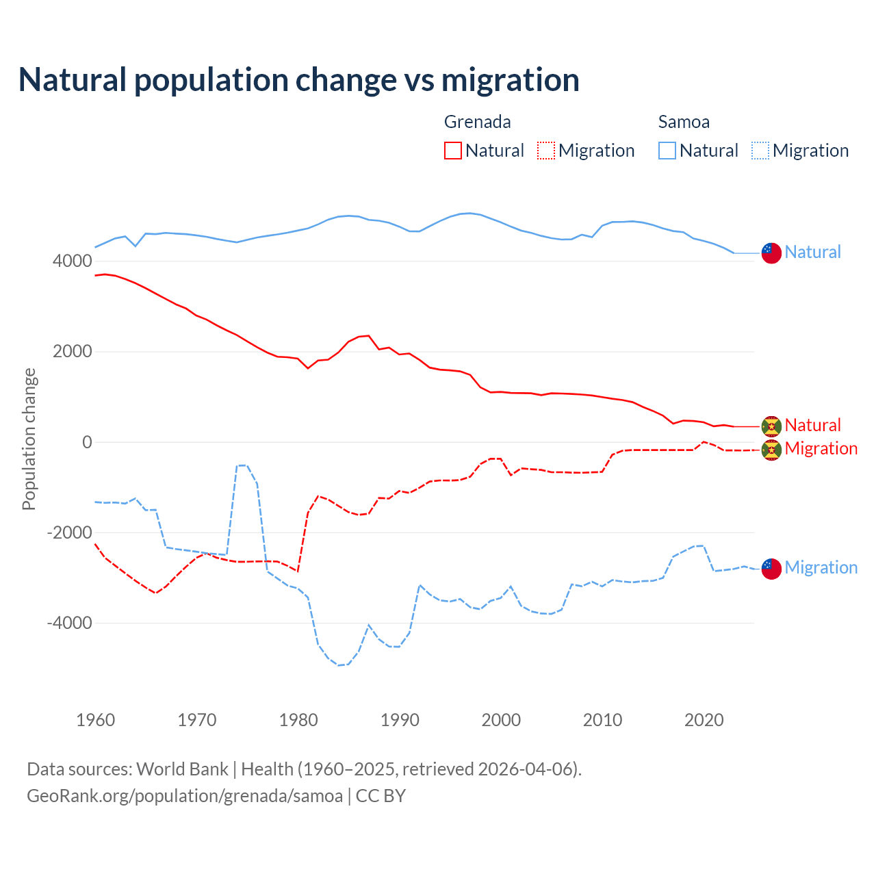 Over the last 10 years, 76% of the population change in Grenada is from natural causes (a gain of 4,850 people) and 24% is from migration (a loss of 1,535 people). In Samoa 62.5% is from natural causes (a gain of 45,436 people) and 37.5% is from migration (a loss of 27,246 people).