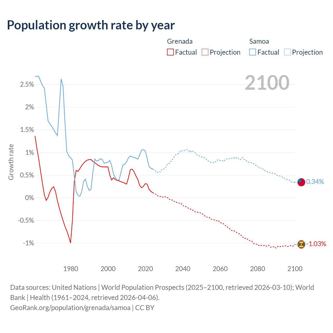 - For the last 10 years, Grenada has had an average growth rate of +0.29% per year vs +0.87% in Samoa.