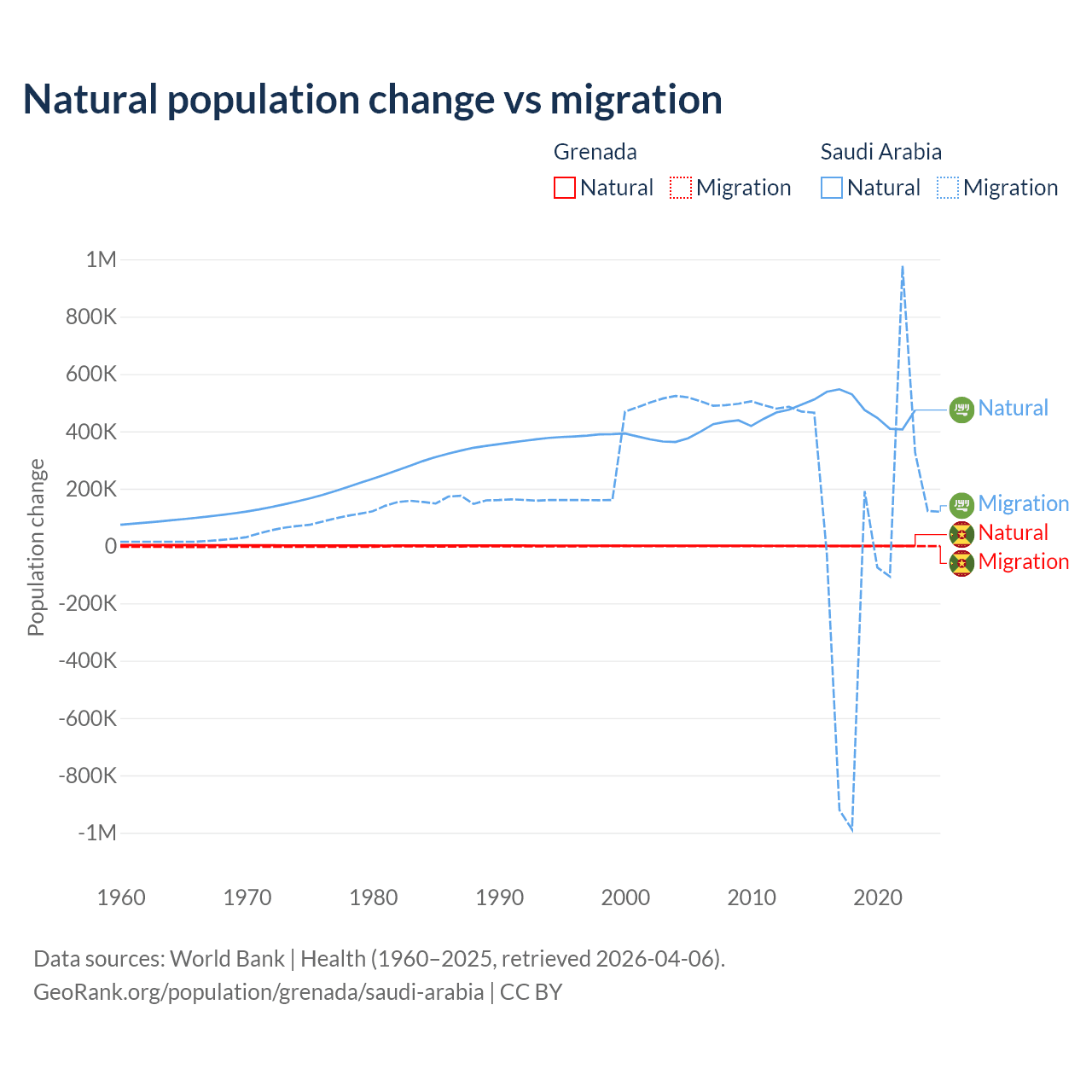Over the last 10 years, 76% of the population change in Grenada is from natural causes (a gain of 4,850 people) and 24% is from migration (a loss of 1,535 people). In Saudi Arabia 93.9% is from natural causes (a gain of 4,829,562 people) and 6.05% is from migration (a gain of 311,209 people).