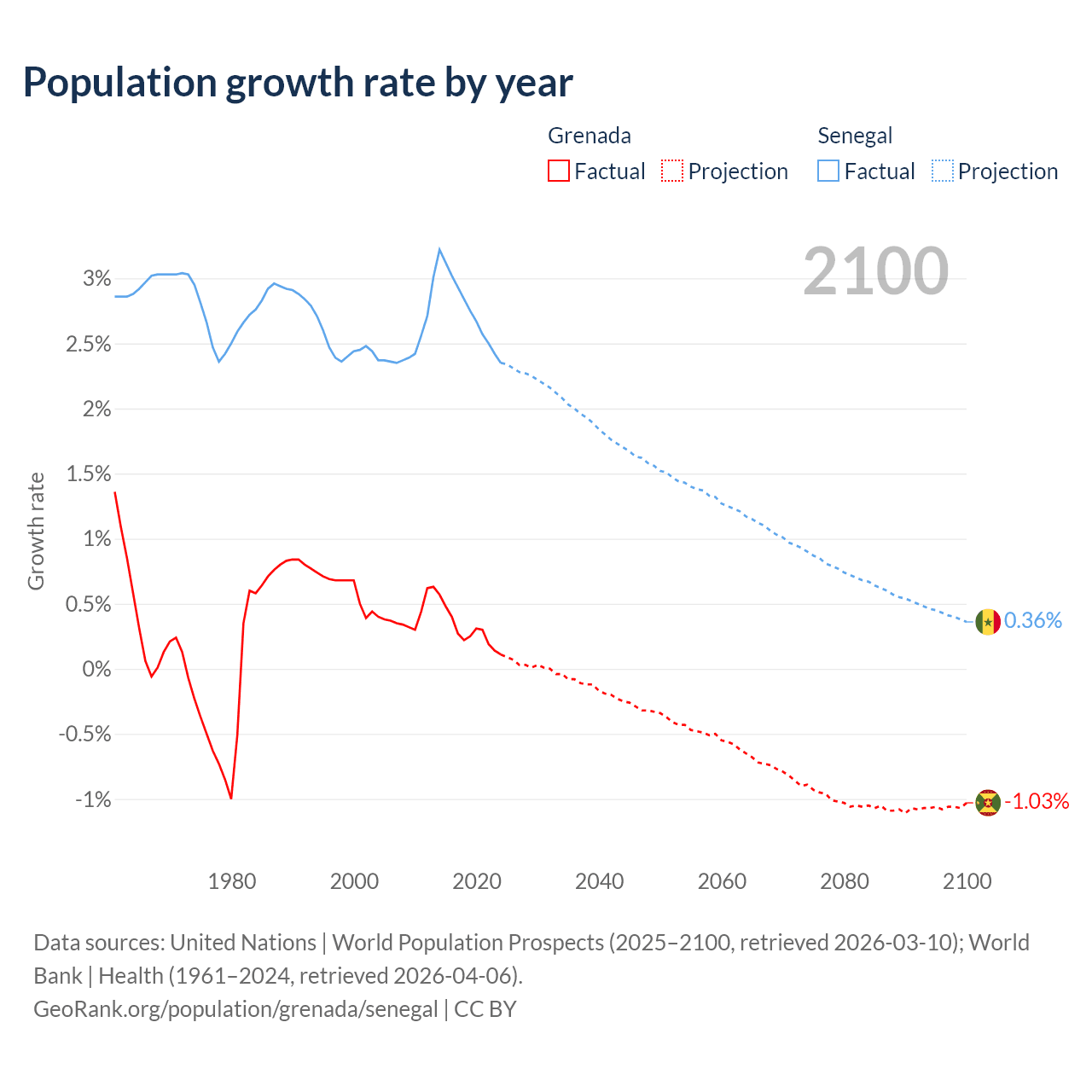 - For the last 10 years, Grenada has had an average growth rate of +0.29% per year vs +2.76% in Senegal.