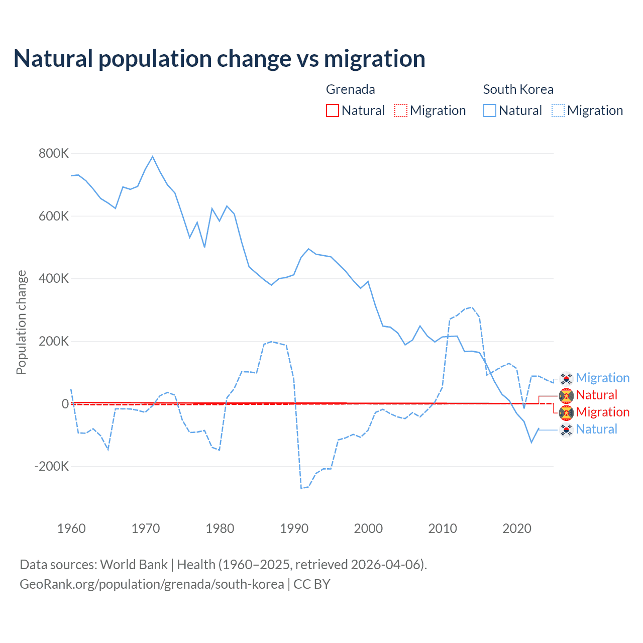 Over the last 10 years, 76% of the population change in Grenada is from natural causes (a gain of 4,850 people) and 24% is from migration (a loss of 1,535 people). In South Korea 17.6% is from natural causes (a gain of 277,215 people) and 82.4% is from migration (a gain of 1,298,356 people).