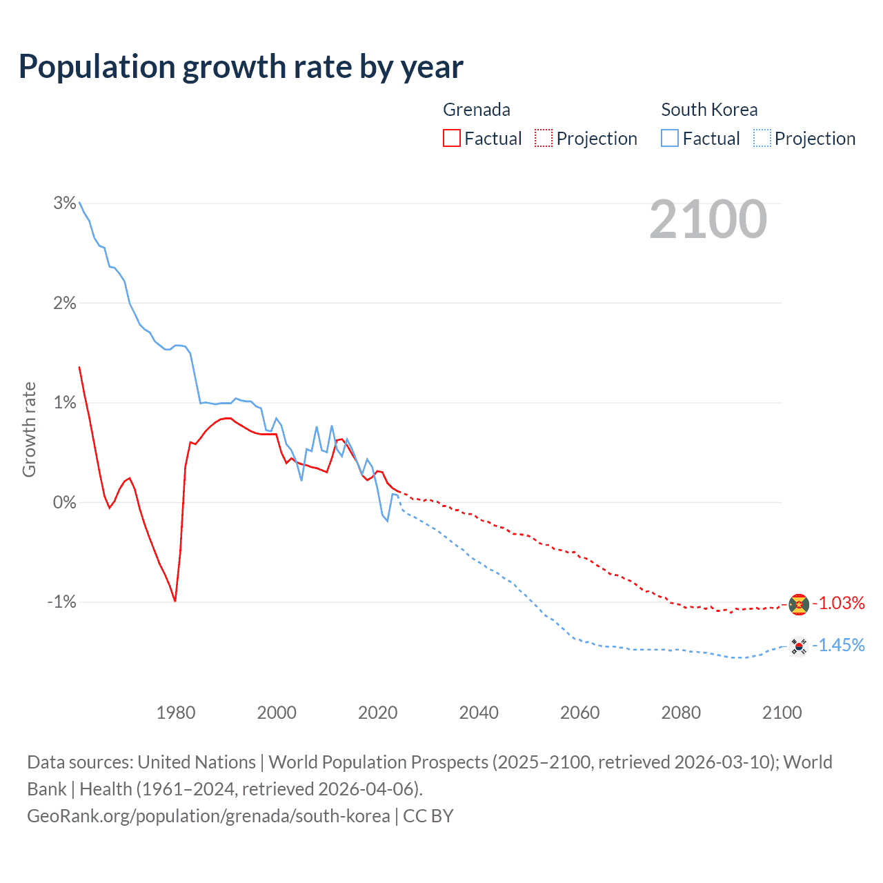- For the last 10 years, Grenada has had an average growth rate of +0.29% per year vs +0.24% in South Korea.