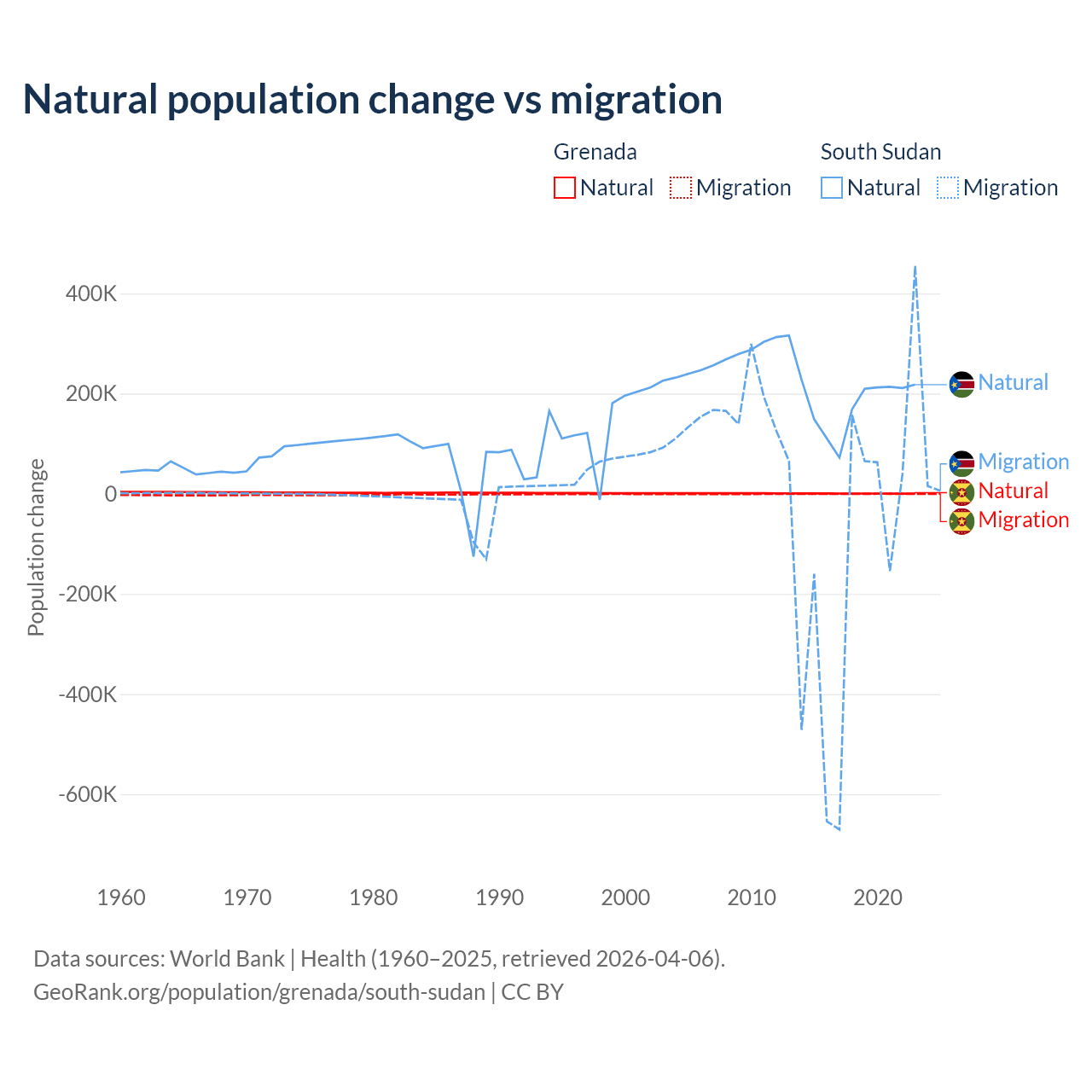 Over the last 10 years, 76% of the population change in Grenada is from natural causes (a gain of 4,850 people) and 24% is from migration (a loss of 1,535 people). In South Sudan 57.4% is from natural causes (a gain of 1,792,135 people) and 42.6% is from migration (a loss of 1,329,606 people).