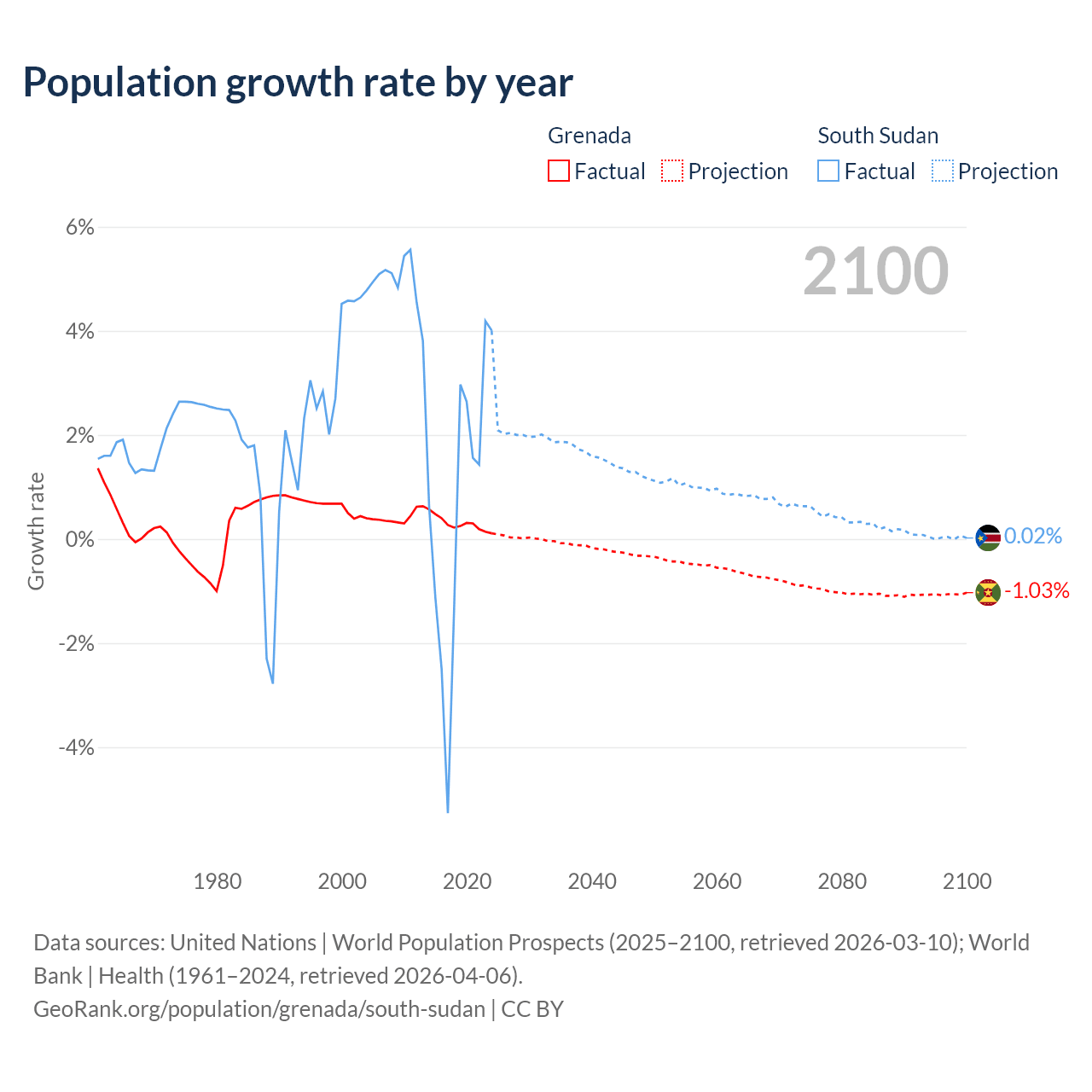 - For the last 10 years, Grenada has had an average growth rate of +0.29% per year vs +0.65% in South Sudan.