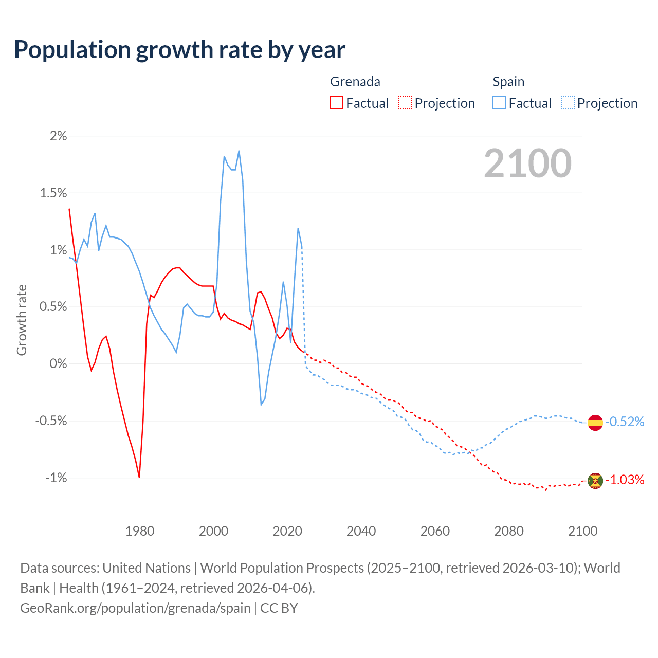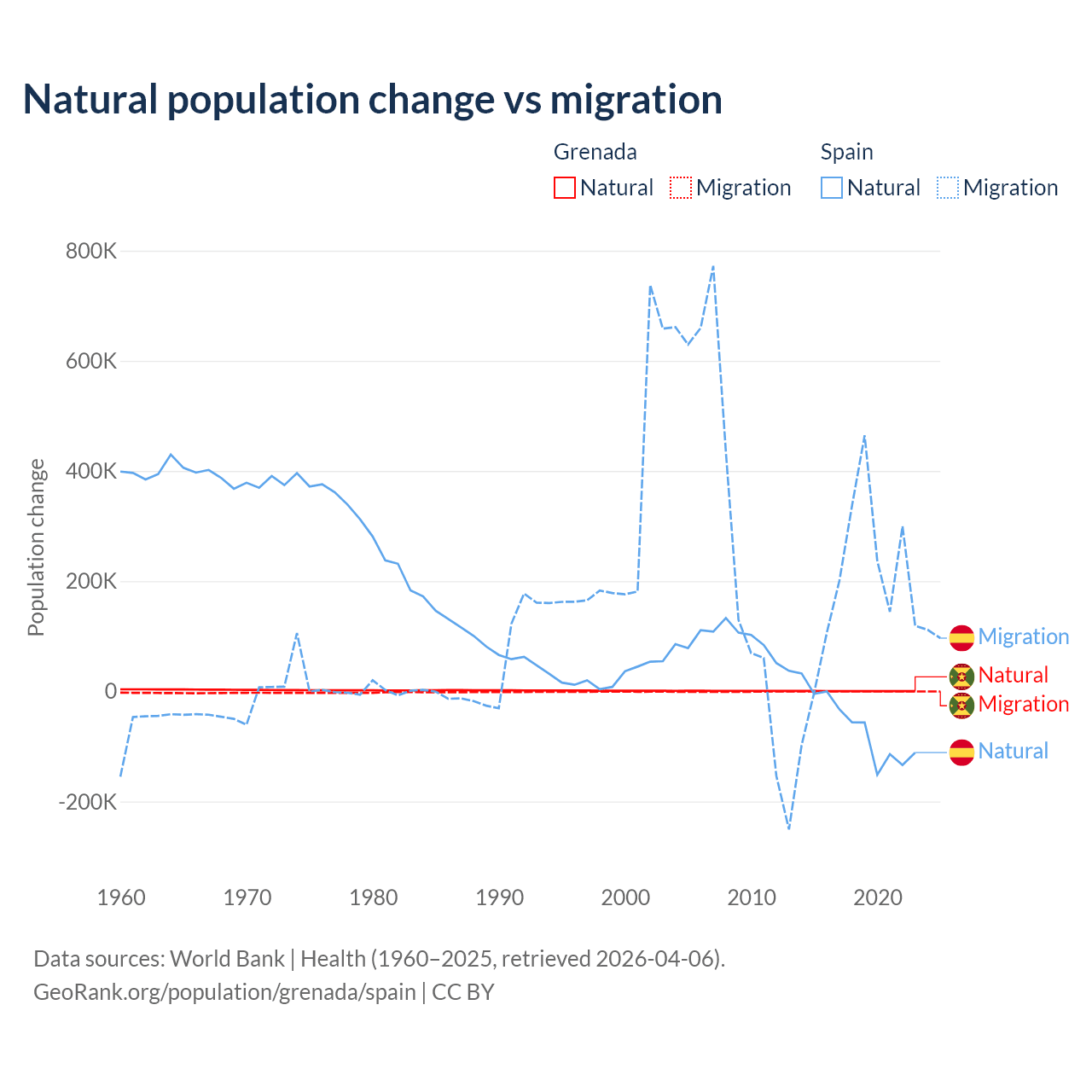 Over the last 10 years, 76% of the population change in Grenada is from natural causes (a gain of 4,850 people) and 24% is from migration (a loss of 1,535 people). In Spain 25.8% is from natural causes (a loss of 627,829 people) and 74.2% is from migration (a gain of 1,810,127 people).