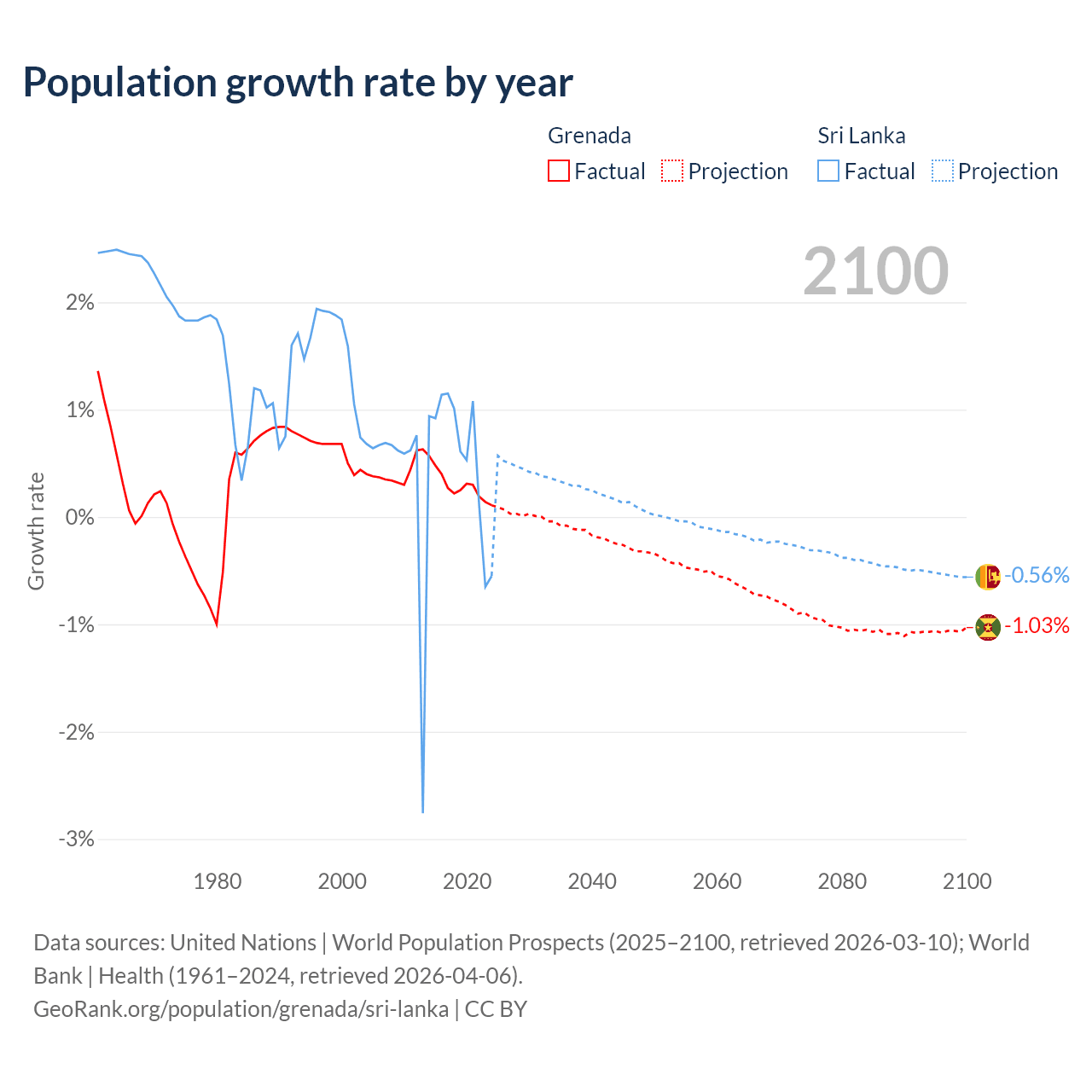 - For the last 10 years, Grenada has had an average growth rate of +0.29% per year vs +0.57% in Sri Lanka.