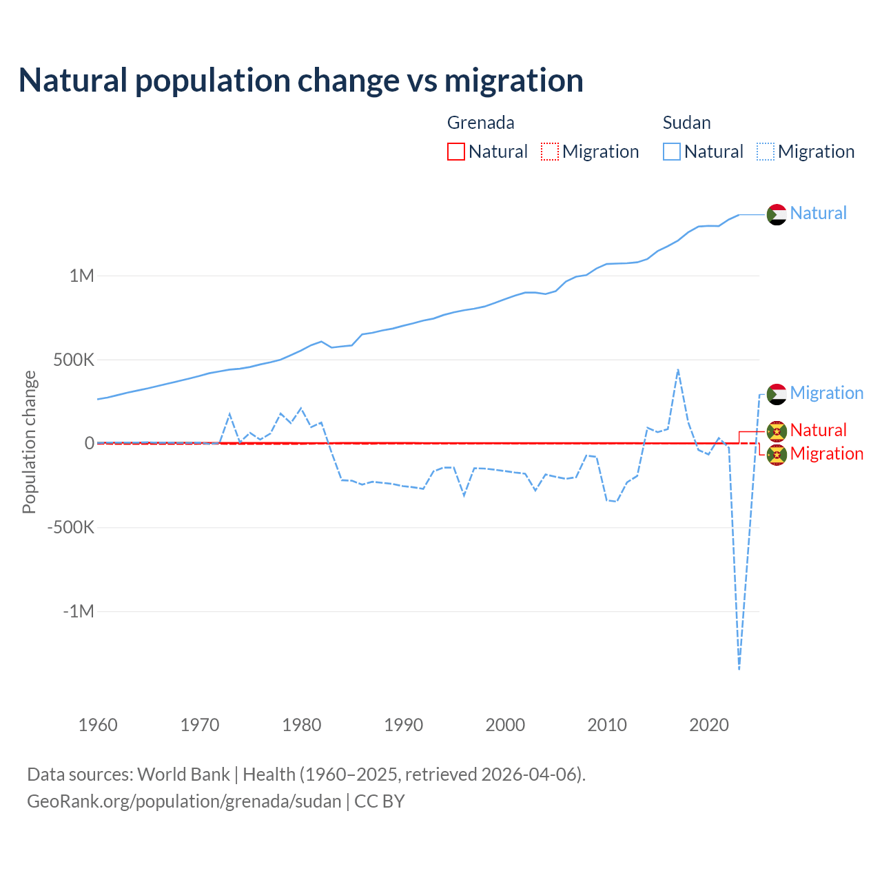 Over the last 10 years, 76% of the population change in Grenada is from natural causes (a gain of 4,850 people) and 24% is from migration (a loss of 1,535 people). In Sudan 95.1% is from natural causes (a gain of 12,459,977 people) and 4.88% is from migration (a loss of 639,596 people).