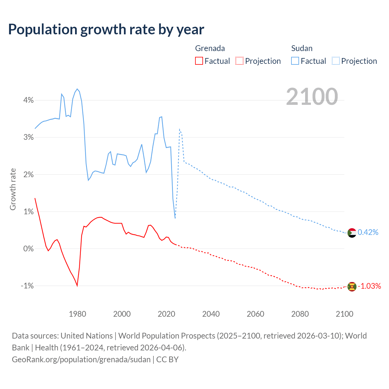 - For the last 10 years, Grenada has had an average growth rate of +0.29% per year vs +2.67% in Sudan.