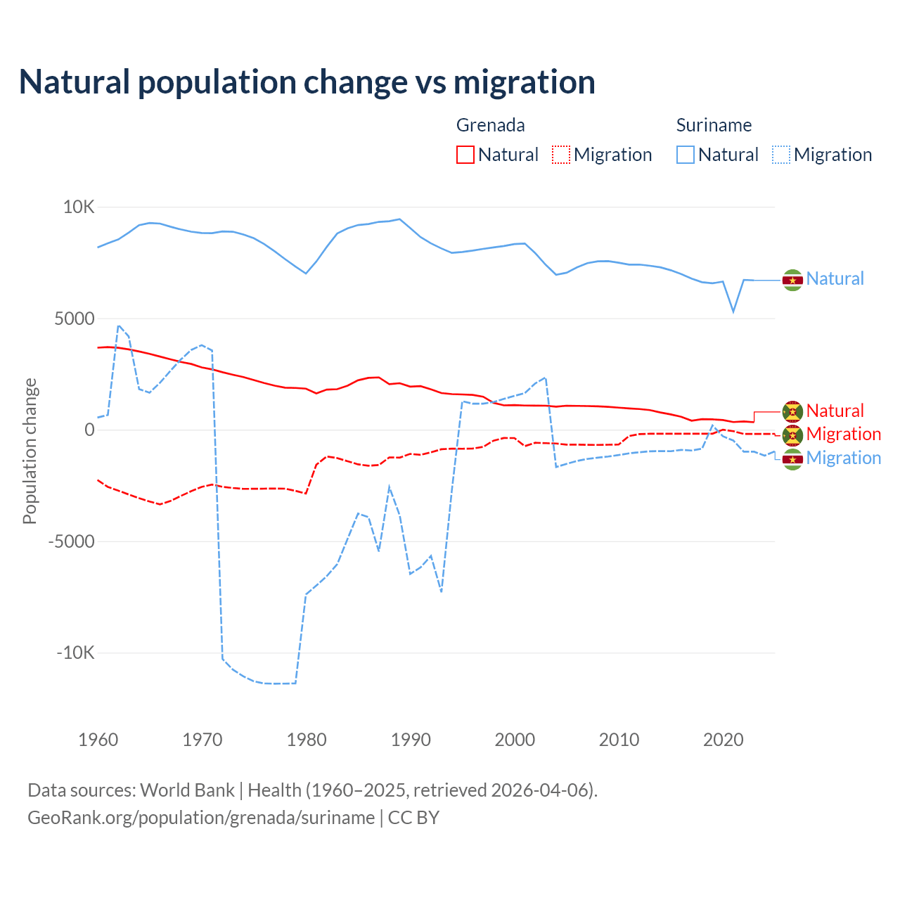 Over the last 10 years, 76% of the population change in Grenada is from natural causes (a gain of 4,850 people) and 24% is from migration (a loss of 1,535 people). In Suriname 90.3% is from natural causes (a gain of 66,709 people) and 9.72% is from migration (a loss of 7,185 people).