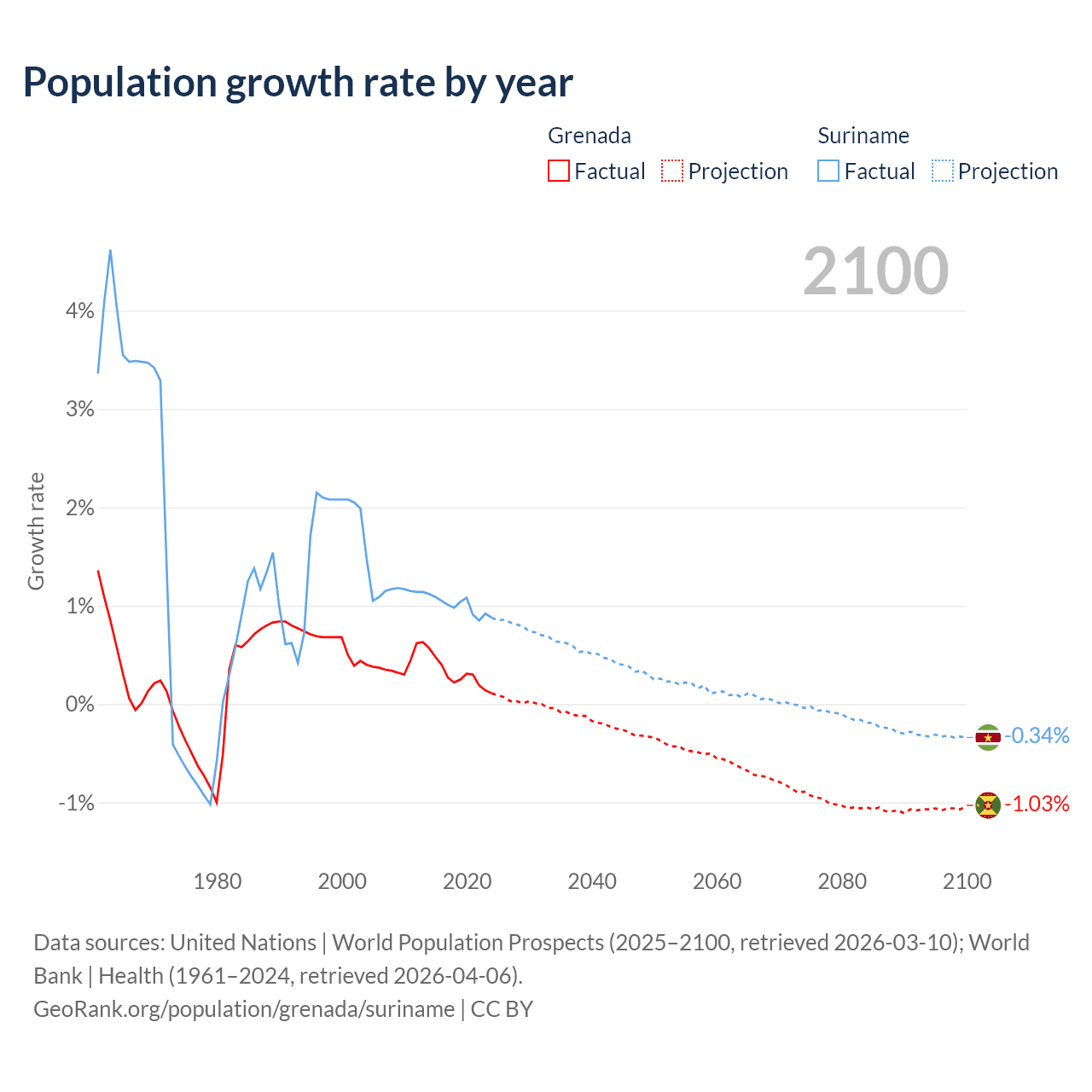 - For the last 10 years, Grenada has had an average growth rate of +0.29% per year vs +0.99% in Suriname.