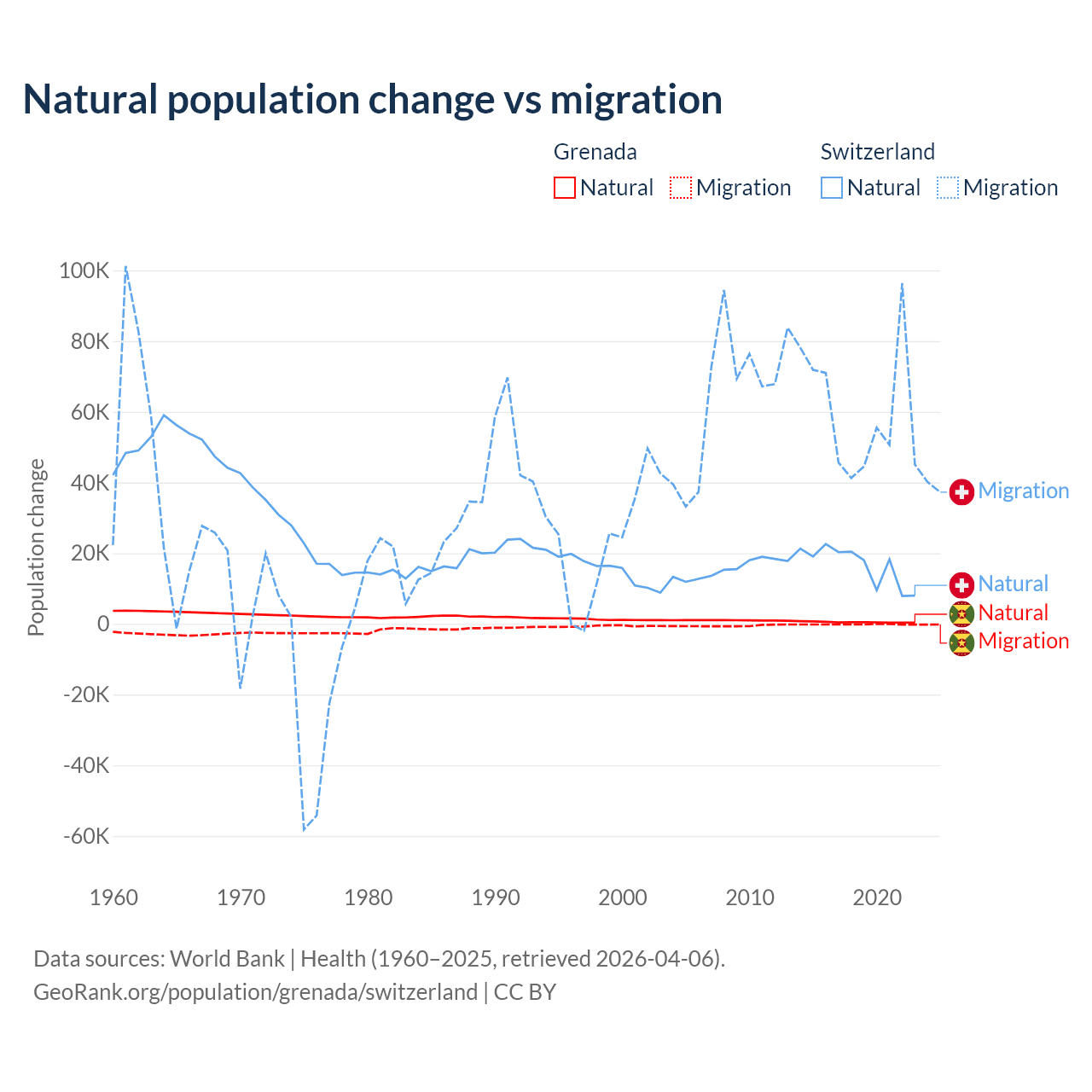 Over the last 10 years, 76% of the population change in Grenada is from natural causes (a gain of 4,850 people) and 24% is from migration (a loss of 1,535 people). In Switzerland 21.6% is from natural causes (a gain of 165,354 people) and 78.4% is from migration (a gain of 600,145 people).