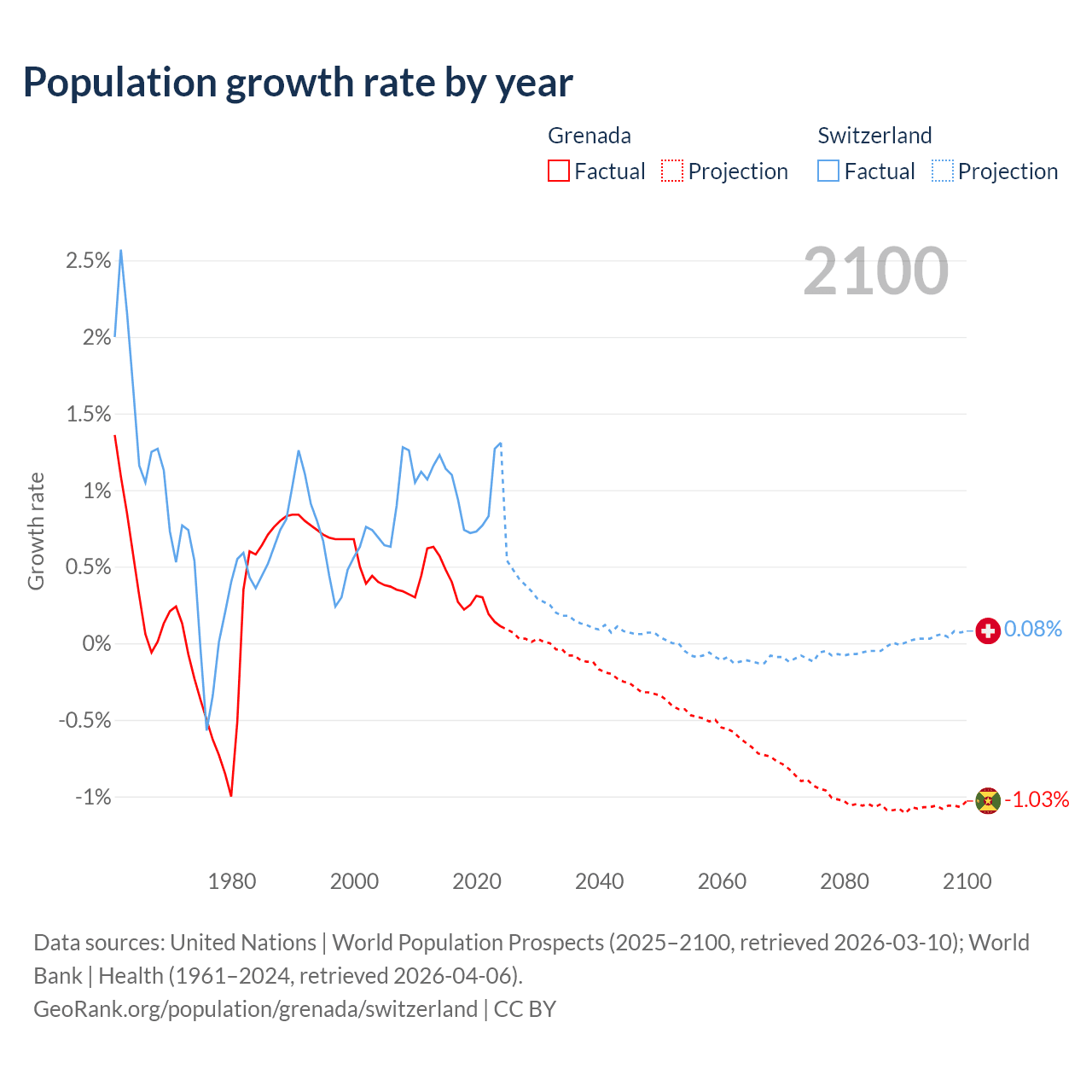 - For the last 10 years, Grenada has had an average growth rate of +0.29% per year vs +0.98% in Switzerland.