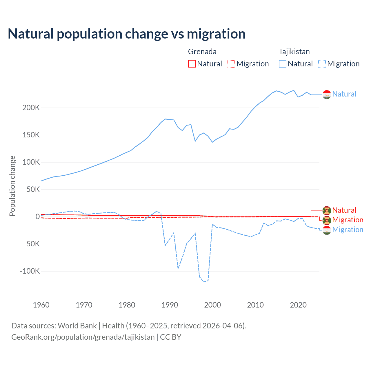 Over the last 10 years, 76% of the population change in Grenada is from natural causes (a gain of 4,850 people) and 24% is from migration (a loss of 1,535 people). In Tajikistan 96% is from natural causes (a gain of 2,266,045 people) and 3.95% is from migration (a loss of 93,205 people).