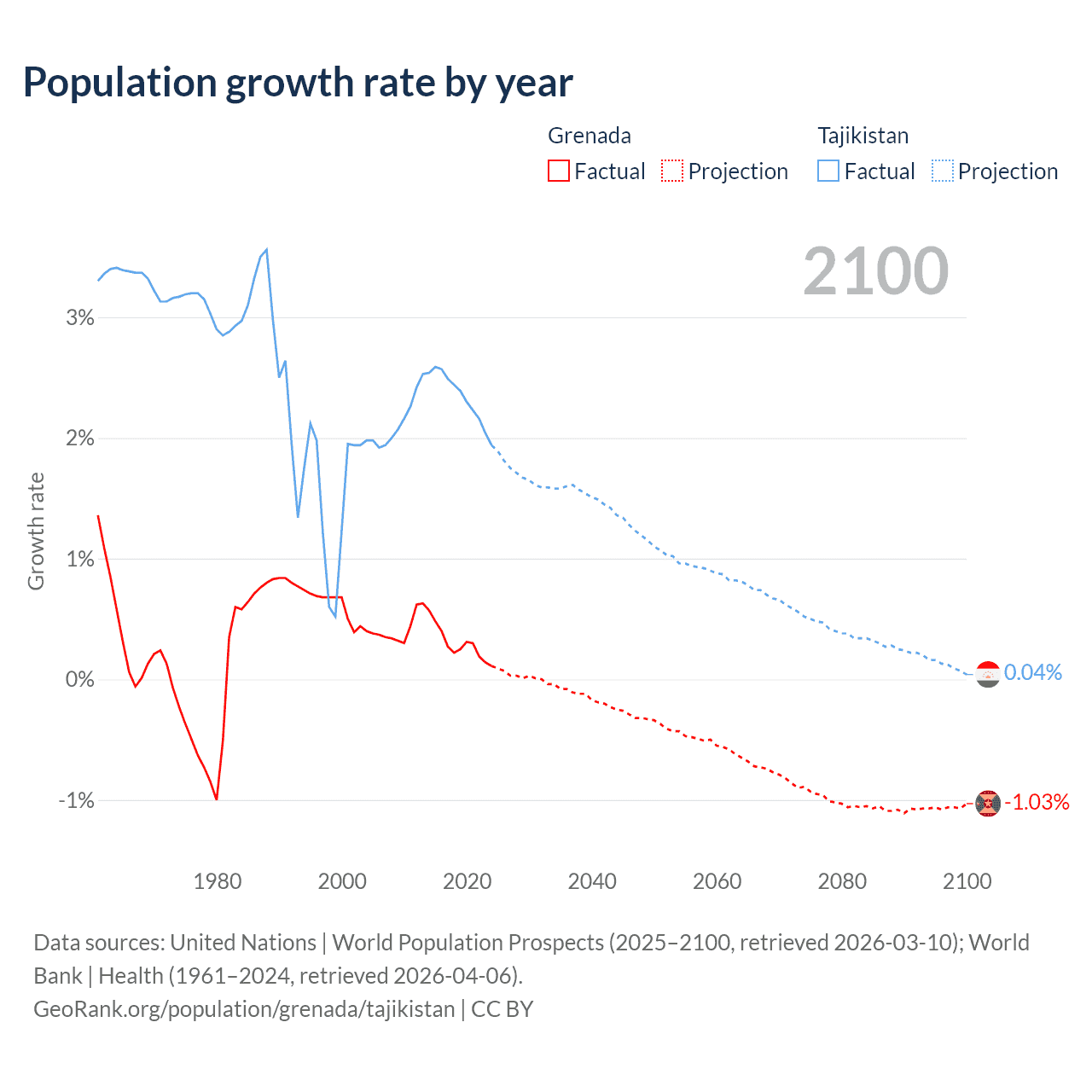 - For the last 10 years, Grenada has had an average growth rate of +0.29% per year vs +2.33% in Tajikistan.