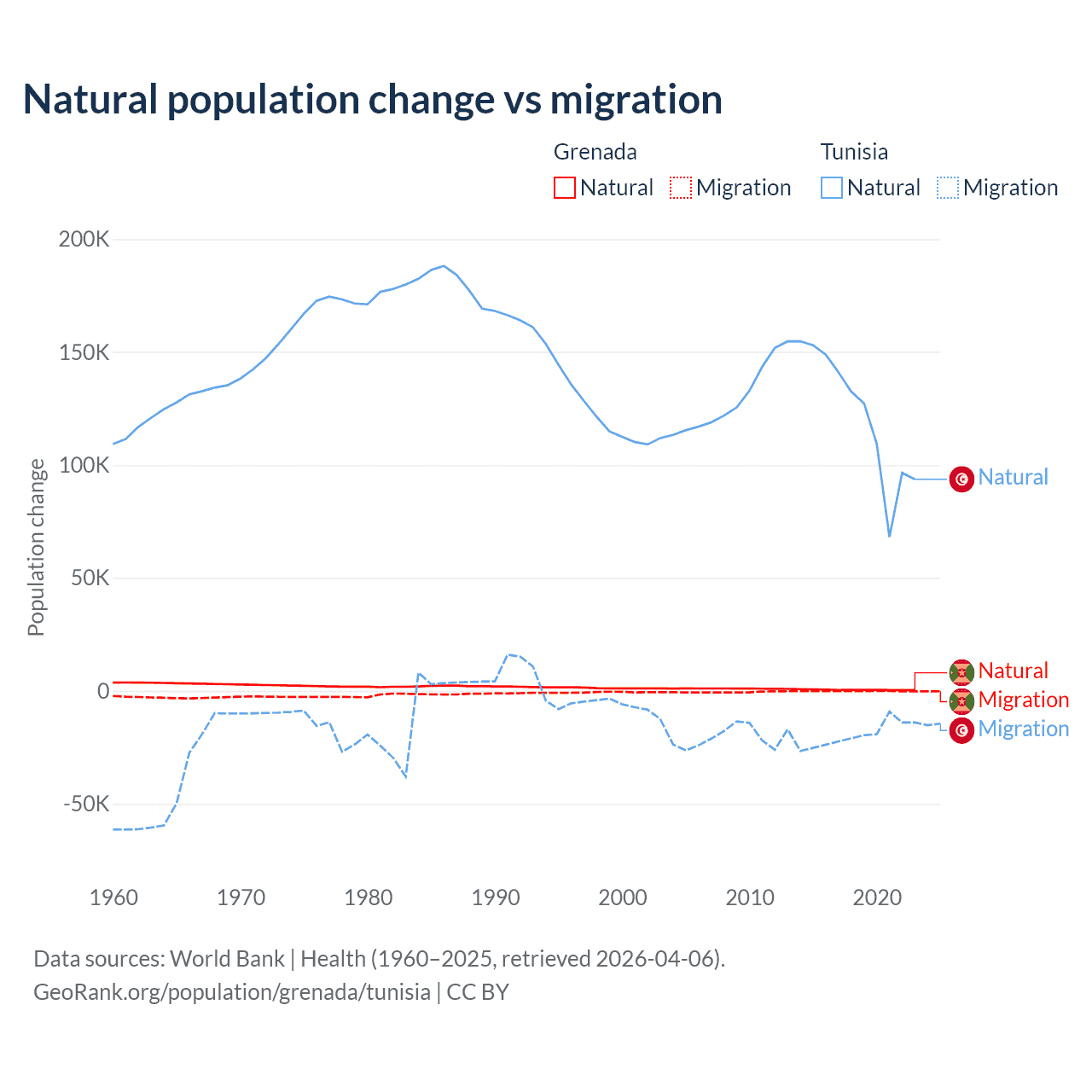 Over the last 10 years, 76% of the population change in Grenada is from natural causes (a gain of 4,850 people) and 24% is from migration (a loss of 1,535 people). In Tunisia 86.3% is from natural causes (a gain of 1,225,079 people) and 13.7% is from migration (a loss of 195,011 people).