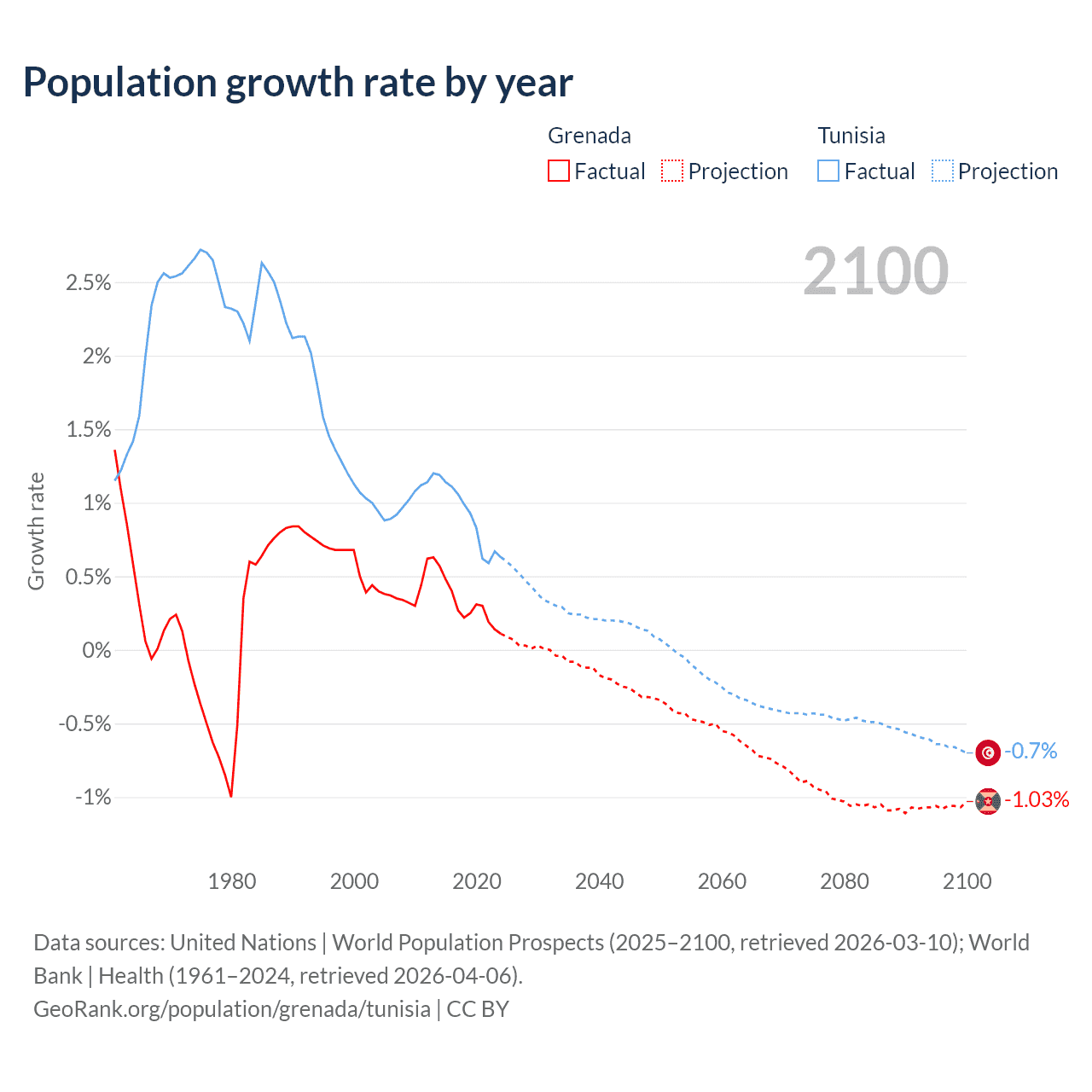 - For the last 10 years, Grenada has had an average growth rate of +0.29% per year vs +0.89% in Tunisia.