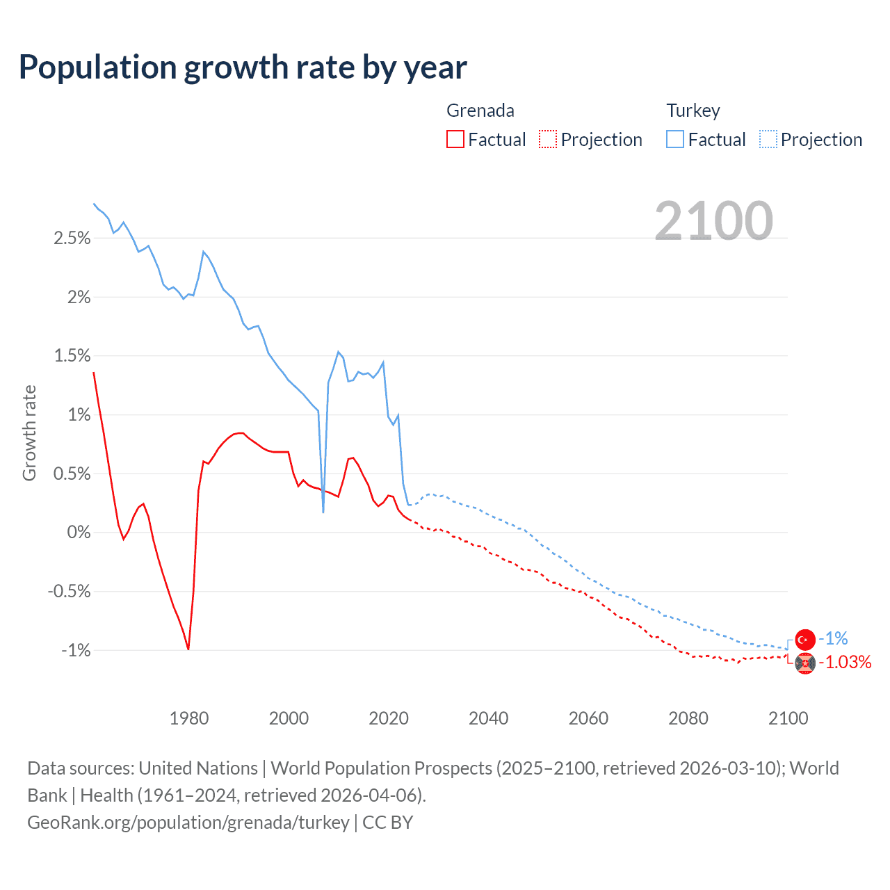 - For the last 10 years, Grenada has had an average growth rate of +0.29% per year vs +1.06% in Turkey.