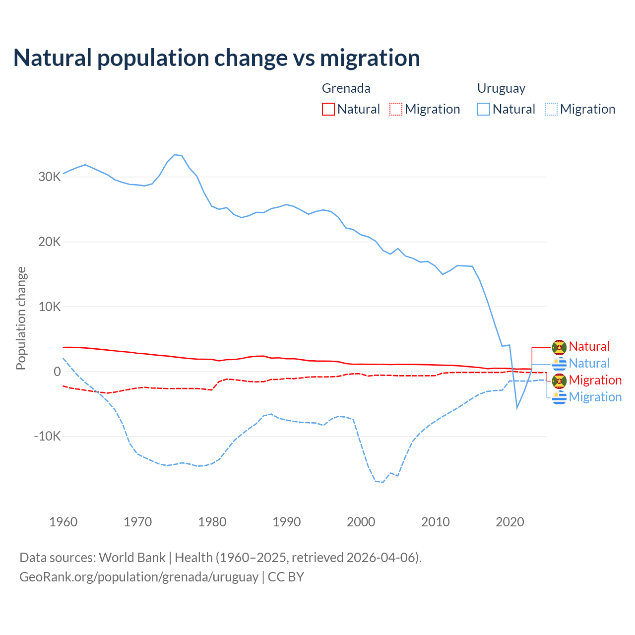 Over the last 10 years, 76% of the population change in Grenada is from natural causes (a gain of 4,850 people) and 24% is from migration (a loss of 1,535 people). In Uruguay 70% is from natural causes (a gain of 64,303 people) and 30% is from migration (a loss of 27,501 people).